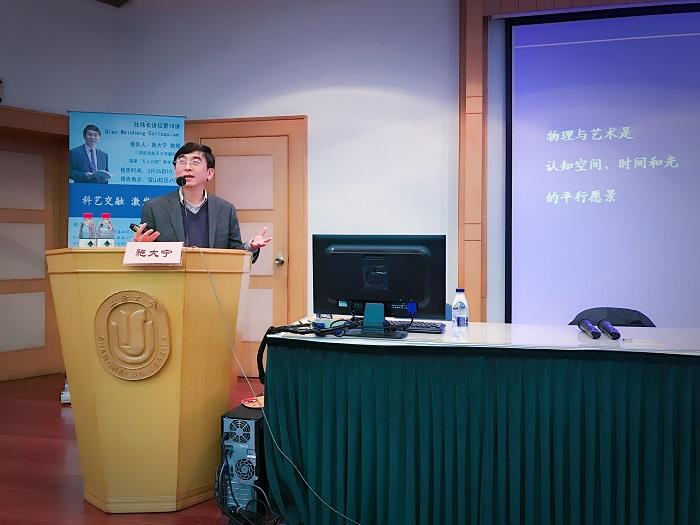 首先施大宁教授通过爱因斯坦的吸烟斗的卡通图片和毕加索的“女士读书图”引出了题目“科艺交融,激发创新”的主题,表达了20世纪的科学和艺术两者互相交融,紧密关联,开启了人们认识宇宙自然的新的征程。此后,施大宁教授立足于“物理与艺术是认知空间、时间和光的平行愿景。”的观点,分析了科学和艺术两者的异同和发展。施大宁教授认为,艺术的表现手段是图像和隐喻,物理学家的表现手段是数字和方程,两者表面上对立,但是两者均面对同一个自然,均是人类尝试认知自然的一种手段。此外,施大宁教授指出,科学和艺术的内在联系是创造力,两者发展史上最大的创新是对于空间和时间的认知。无论是哥白尼的日心说,爱因斯坦的相对论,还是乔托的透视画法,毕加索的立体画法,都是千百年来人类对于自身和自己所存在的宇宙的探索和创新。两者构建在绝对时空的基础上,从而诞生了古典艺术和经典物理学。1863年照相机的发明使得艺术走向了抽象时代,表达“眼睛看不见的世界”,同时科学在第二次工业革命之后也开始了微观化,抽象化。使得人们对于世界的理解变的更加的透彻。正所谓“为善不同,同归于美,科艺交融,智慧同光。”
