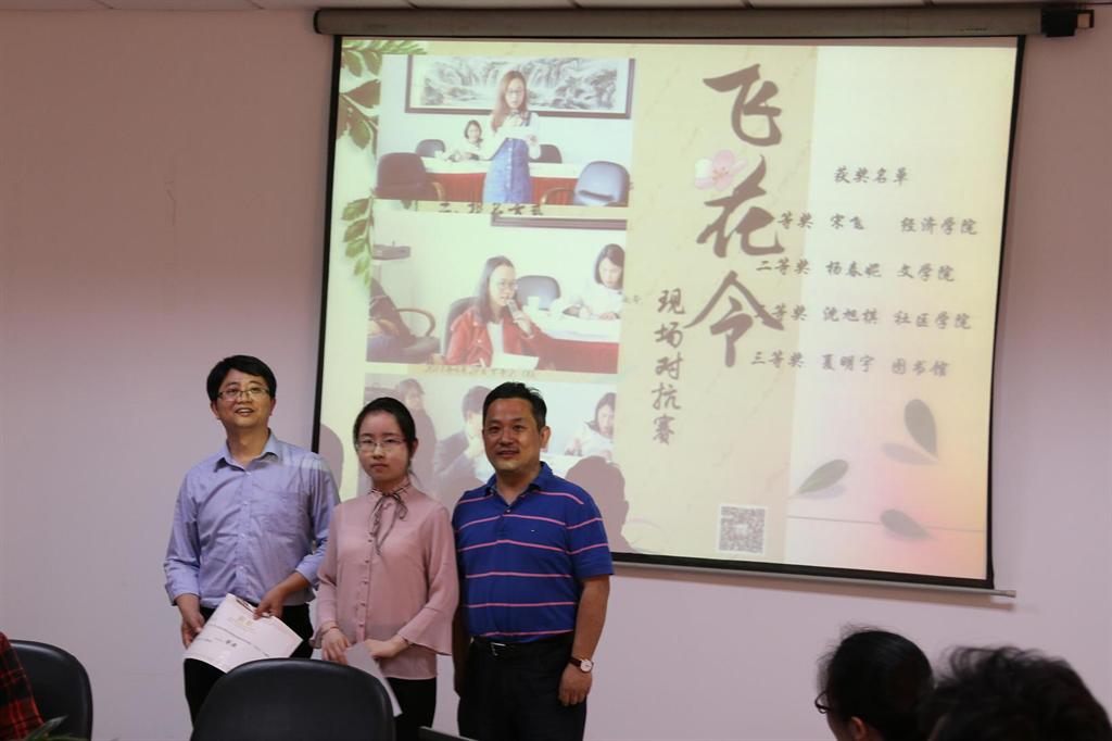闭幕式上播放了读书月精彩活动视频和飞花令现场对抗赛视频。校宣传部部长李坚、图书馆直属党总支书记王远弟和常务副馆长陆铭分别为“我荐经典—优秀经典作品推介线上线下征集活动”、“飞花令现场对抗赛”等活动获奖者颁发了奖状和奖品。