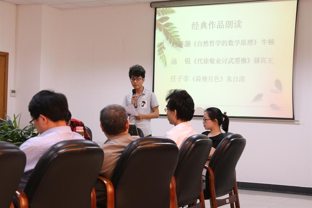 本届读书月闭幕式活动,得到了全校师生的积极响应与热情参与。四叶草书友协会赵泽灏、汤锐和任子非三位同学分别朗读了牛顿的《自然哲学的数学原理》、骆宾王的《代徐敬业讨武曌檄》以及朱自清的《荷塘月色》,他们的朗读使大家充分领略了经典的魅力。“飞花令”活动获奖代表—文学院杨春妮同学和大家分享了她学习中国古典文化的心得。来自机自学院的代表陈晨同学作为“我荐经典”活动的获奖者畅谈了他品读经典作品的方法和感受。与会读者代表还积极互动,对图书馆读书月活动建言献策,提出了很多有建设性的意见。图书馆读者服务中心主任王玉富回顾了历届读书月活动,并与读者亲切互动。图书馆的女教师合唱团献上一曲女声小合唱《假如你要认识我》。