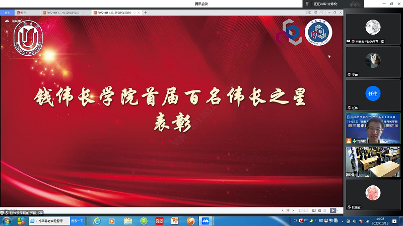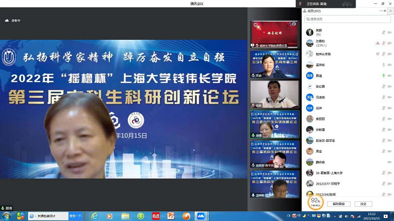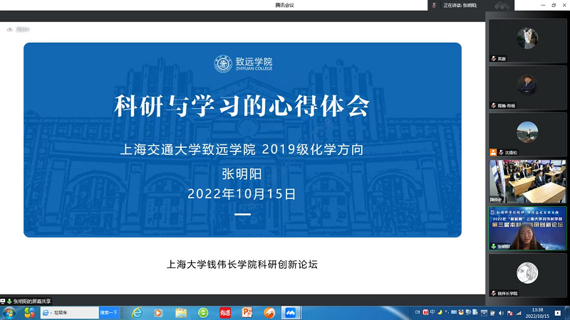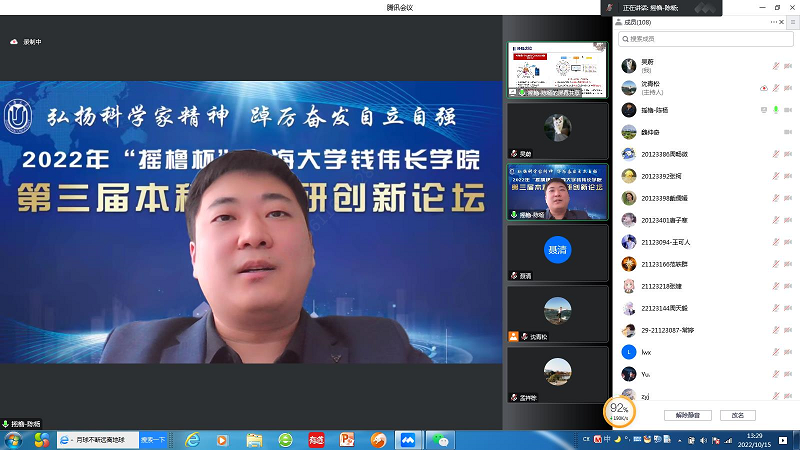 10月15日下午,弘扬科学家精神,踔厉奋发自立自强——2022年“摇橹杯”金沙集团1862cc成色钱伟长学院第三届本科生科研创新论坛举行,因受疫情影响,此次论坛采用线上与线下相结合的方式,并于伟长书院南区2号楼一楼西会议室设立分会场。此次论坛有幸邀请到上海摇橹仪器设备有限公司董事长兼总经理、钱伟长学院2009级校友陈杨,鸿之微科技(上海)股份有限公司董事长曹荣根,中国科学技术大学物理系教授、蔻享学术创始人兼首席科学家乔振华等企业资深专家,同时还邀请了上海交通大学致远学院本科生张明阳和金沙集团1862cc成色博士研究生陆佳宜作为分享嘉宾。金沙集团1862cc成色党委常委、副校长聂清,校学工办主任、武装部部长孟祥栋,校团委书记冯凌燕,钱伟长学院数学方向导师赵发友,物理方向项目主任杨国宏,力学方向导师宋亦诚、楚海建,化学方向项目主任、社区学院副院长许斌,化学方向导师邢菲菲,生命科学方向导师陈红霞,材料设计科学与工程方向导师席丽丽,钱伟长学院党委书记吴蔚,党委副书记、院长周全,副院长许新建、任伟线上出席了本次论坛。钱伟长学院辅导员组织各年级学生线上观摩了本次论坛。论坛由钱伟长学院党委副书记、副院长沈青松主持。