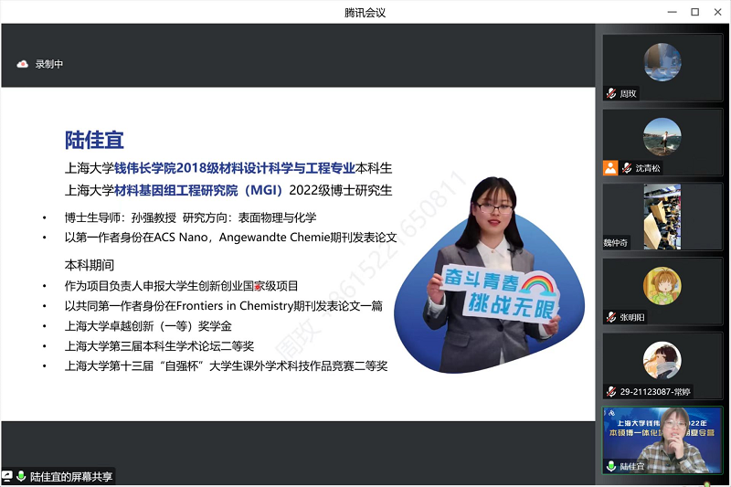 接着,由兄弟高校本科生代表、校友代表做了科研项目展示与科研经验分享。来自上海交通大学致远学院的本科生张明阳同学曾以共同第一作者在国际顶级期刊《Chemical Engineering Journal》发表综述文章,她参与校级PRP项目并获评为A等,还主持了一项“莙政学者项目”。论坛期间,她以一位学姐的身份分享了自己的科研经历与科研学习的心得体会,为学弟学妹们提出了许多合理性的建议,同时劝诫同学们对待科研不可急功近利,要享受科研过程中的重复与失败。金沙集团1862cc成色材料基因组工程研究院2022级博士研究生、钱伟长学院材料设计科学与工程专业2018级本科校友陆佳宜同学分享期间,结合自己本科期间在科研方面的经历,强调要学会主动追踪研究的前沿动态,逐渐找到值得自己深入研究的兴趣点,形成明确接触科研的目的,对于自己的课题,要有主人翁的意识,学会主动和学术同行交流,合理规划并管理好时间。