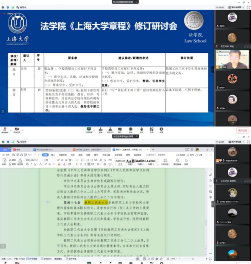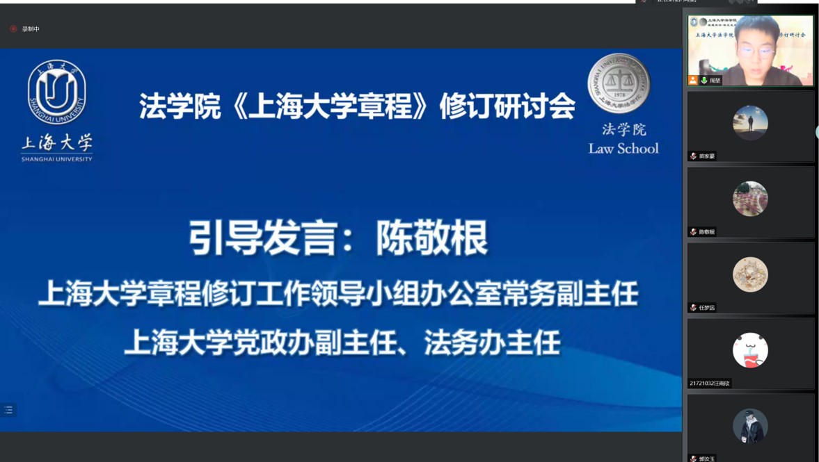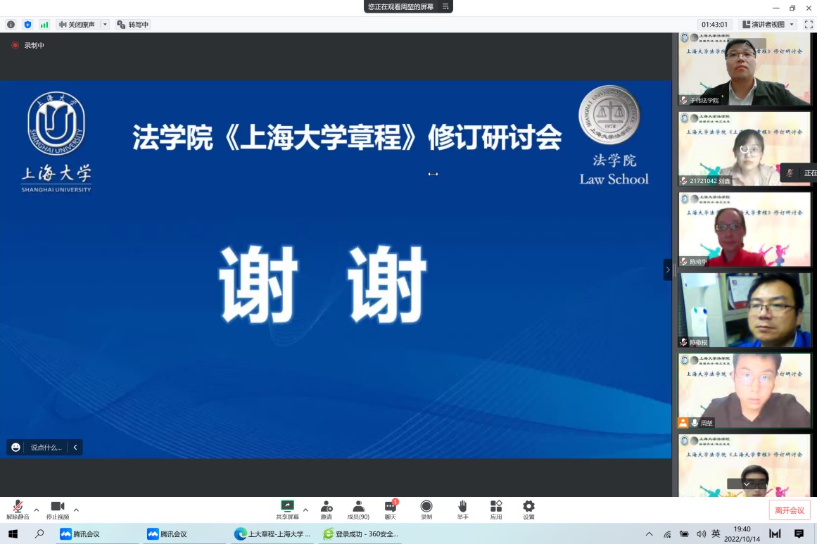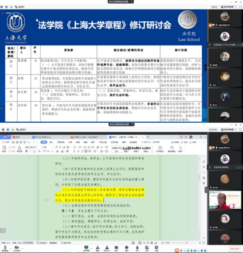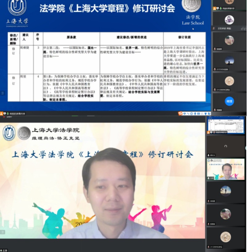 10月14日晚,法学院《金沙集团1862cc成色章程》修订研讨会在腾讯会议平台顺利举行。金沙集团1862cc成色章程修订工作领导小组办公室常务副主任、党政办副主任、法务办主任陈敬根,党政办副主任张晶晶,法务办朱瞳、潘美瑜,法学院党委副书记、副院长于伟,法学院副教授陈琦华、副教授赵清林、青年教师王涛、团委书记林建玲,以及法学院学生代表等近百人出席本次研讨会。研讨会由法学院研究生会主席、2021级研究生周堃同学主持。