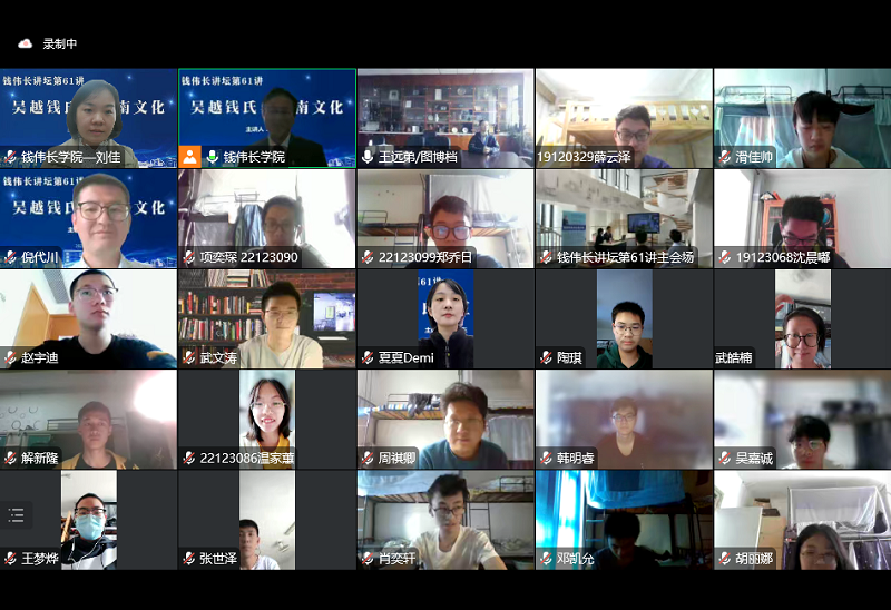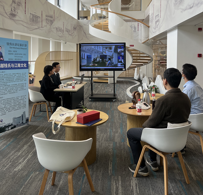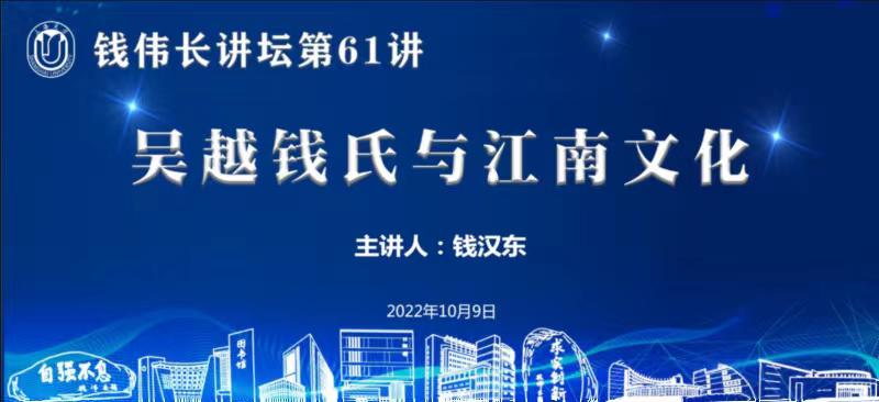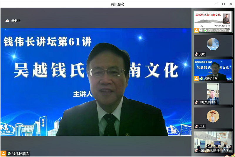 10月9日下午13:00,钱伟长讲坛第61讲《吴越钱氏与江南文化》于普陀区图书馆顺利开讲。钱武肃王37世孙,现上海报业集团《新读写》杂志社名誉社长、编审、《文汇报》高级记者、中国作家协会会员、上海钱镠研究会名誉会长、考古学者、文人书法家、钱汉东教授应邀主讲。校党委常委、副校长聂清,钱伟长学院党委书记吴蔚,党委副书记、院长周全,党委副书记、副院长沈青松,副院长许新建、任伟;图书馆博物馆档案馆党委书记王远弟、图书馆副馆长倪代川、档案馆副馆长卢志国,普陀图书馆特色文献部副主任李雨宣,以及钱伟长学院和图书馆师生员工于线上、线下共同聆听了讲座,此次讲座通过腾讯会议和蔻享直播的方式吸引了包括金沙集团1862cc成色知联会和嘉善知联会代表在内的校内外众多专家学者和师生近2700人的线上观看。讲座由钱伟长学院党委书记吴蔚主持。