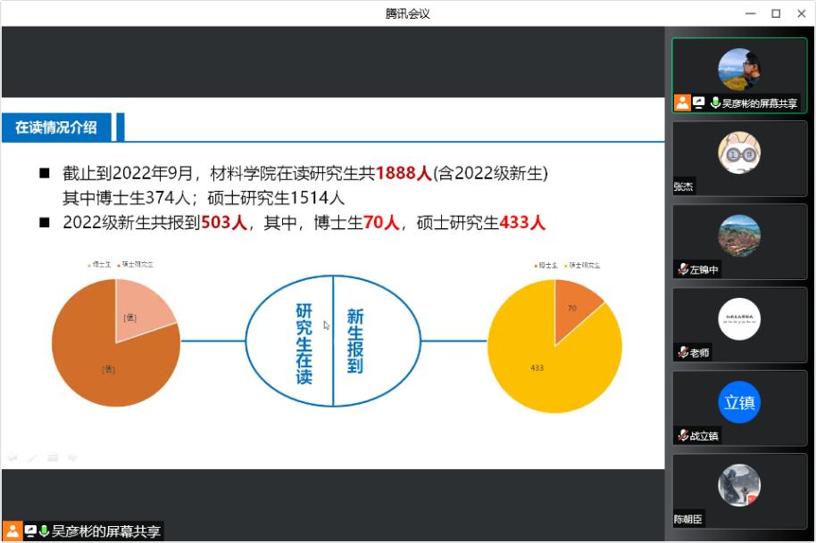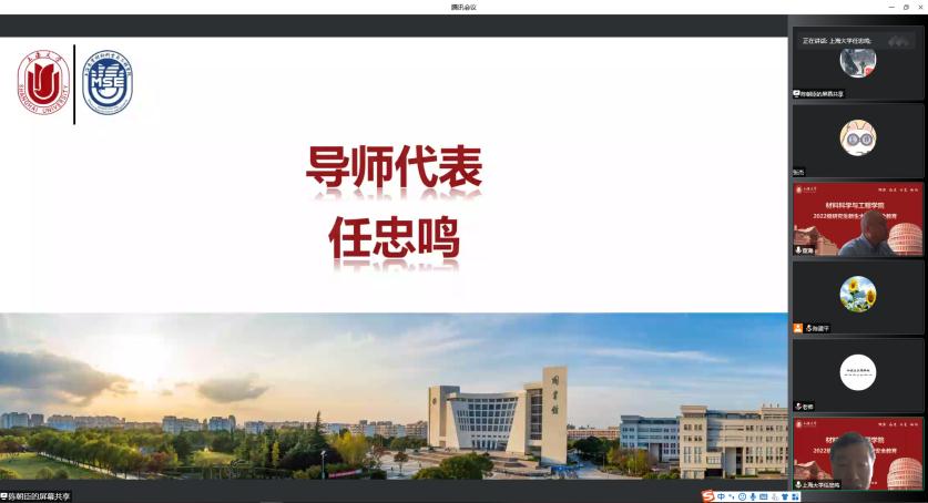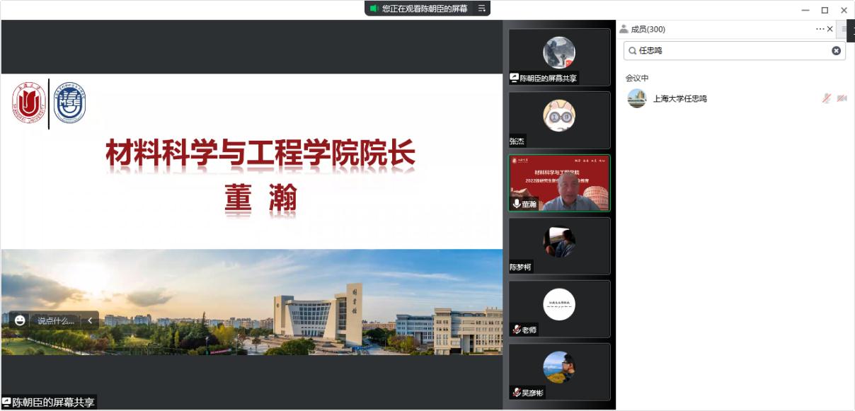 9月16日下午,材料学院于线上举行2022级研究生新生大会暨安全教育。出席本次大会的有材料学院院长董瀚,党委书记王江,党委副书记、副院长祁晶,副院长钟云波、黄健、朱波、李文,省部共建高品质特殊钢冶金与制备国家重点实验室主任任忠鸣,以及学院各系所主任、学院教学团队和专兼职辅导员。本次大会由2021级硕士研究生吴秋月主持。