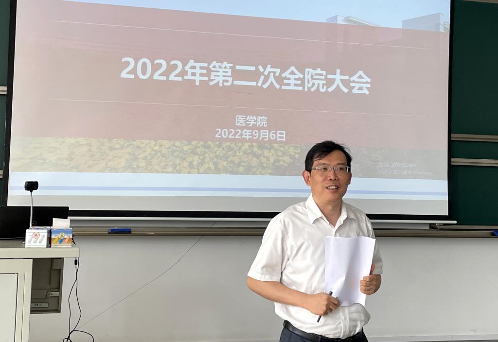 9月6日下午,医学院在东区14号楼201会议室召开2022年第二次全院大会,总结回顾学院上半年工作情况,安排部署学院新学期重点工作。会议由医学院党委书记竺剑主持。