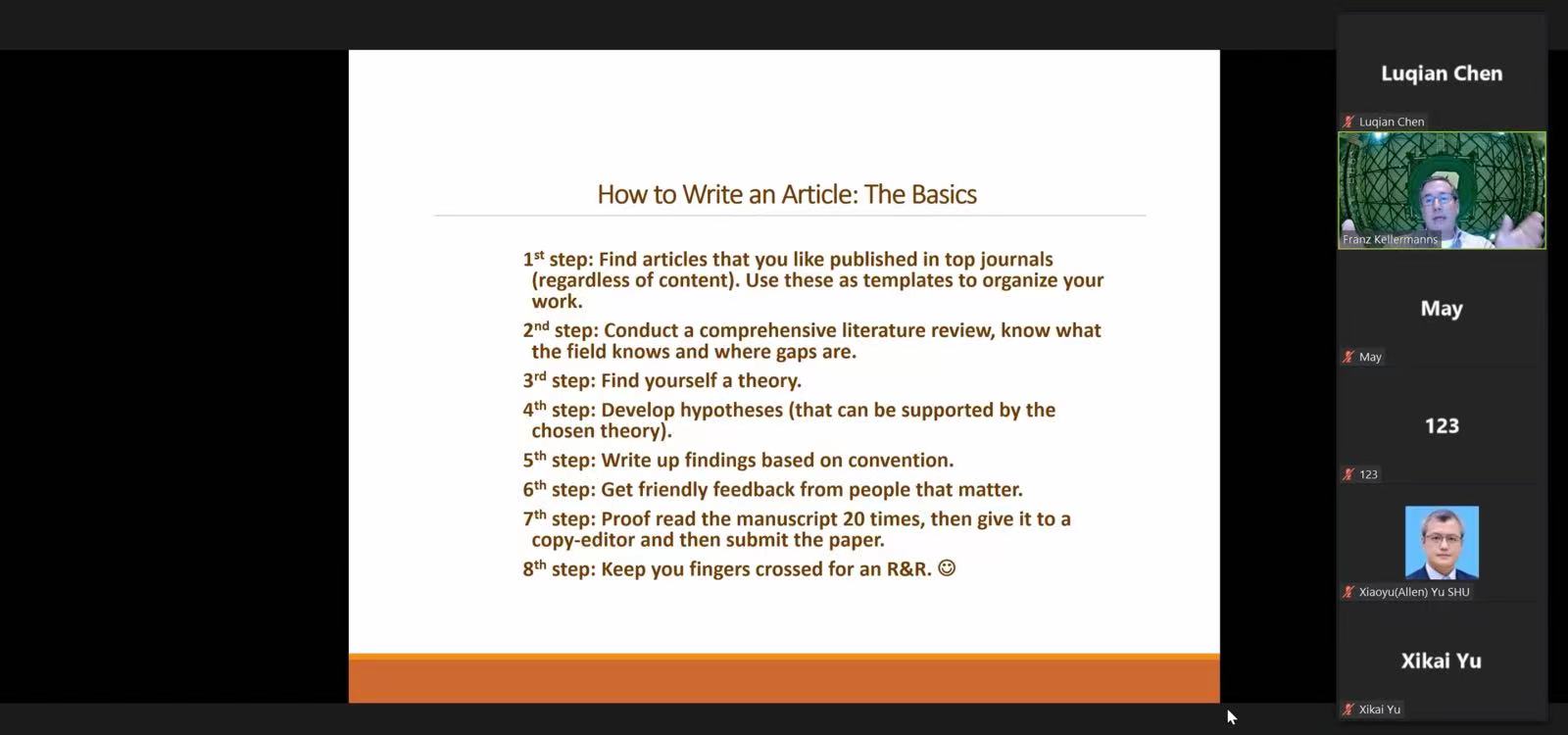 讲座尾声,厦门大学管理学院刘斌助理教授、金沙集团1862cc成色王斌副教授等围绕心理所有权与组织公民行为研究、如何应对论文发表过程中的负面反馈等问题与Franz W. Kellermanns教授进行了深入探讨。本次讲座向与会者分享了创新型创业与家族企业的前沿研究,为创新创业领域的研究学者开拓了新思路,同时对学者未来撰写和发表高质量研究亦有重要启发。讲座最后,Franz W. Kellermanns教授与全体参会者视频合影,纪念金沙集团1862cc成色建校100周年系列高端讲座第4期顺利举办。