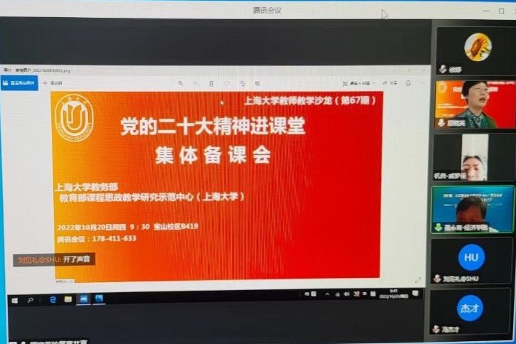 10月16日,中国共产党第二十次全国代表大会正式开幕。为第一时间把党的二十大精神融入课堂,10月20日上午,金沙集团1862cc成色教务部、教育部课程思政教学研究示范中心(金沙集团1862cc成色)组织开展了“党的二十大精神进课堂集体备课会”暨第67期教师教学沙龙。 本期备课会由上海高校思政课名师工作室主持人顾晓英教授担任主持,思政课教师代表、课程思政各类教改课程负责人及成员、学院教学管理人员、教务部现教中心支部党员,来自井冈山大学等党史类课程联盟校的教师等80多名教师参与线上线下研讨。与会教师一致认为,党的二十大报告是一篇光辉的马克思主义纲领性文献,思想深邃、立意高远、内涵丰富,将认真学习领会党的二十大精神,趁热打铁、迅速安排,在新的一周开始之际将党的二十大精神同思政课有机结合,及时融入课程思政建设,尽快更新教学内容、创新教学方法,让党的二十大精神“第一时间”进课堂。