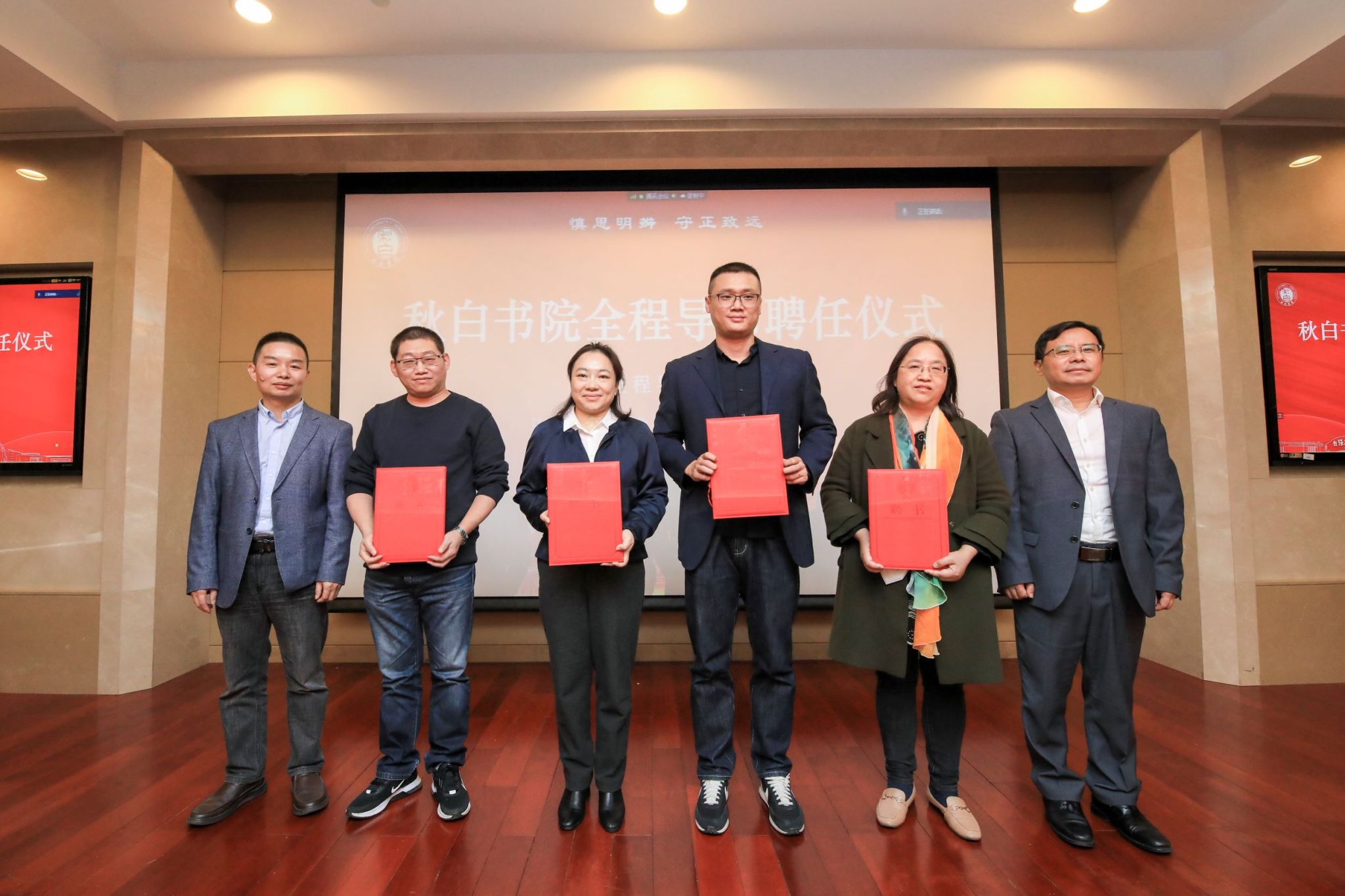 在全程导师聘任仪式上,学生工作办公室主任、本科生书院管理中心主任孟祥栋老师、秋白书院院长肖瑛老师为全程导师代表鲍建竹、芦雪峰、赵宇阳、李红霞四位老师颁发聘书,希望全程导师们能够为书院学生的成长筑梦助力。