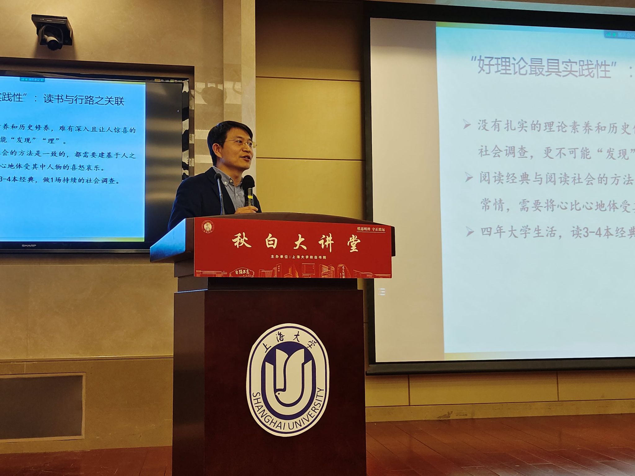 大讲堂的后半场,秋白书院院长、社会学系主任肖瑛教授为同学们带来了题为《读万卷书,行万里路》的讲座。肖瑛教授强调,大学教育不仅仅要有技术、观念,更要沉淀素养。肖教授引用了费孝通的名言,强调读书和调查是培养综合素养的关键途径。