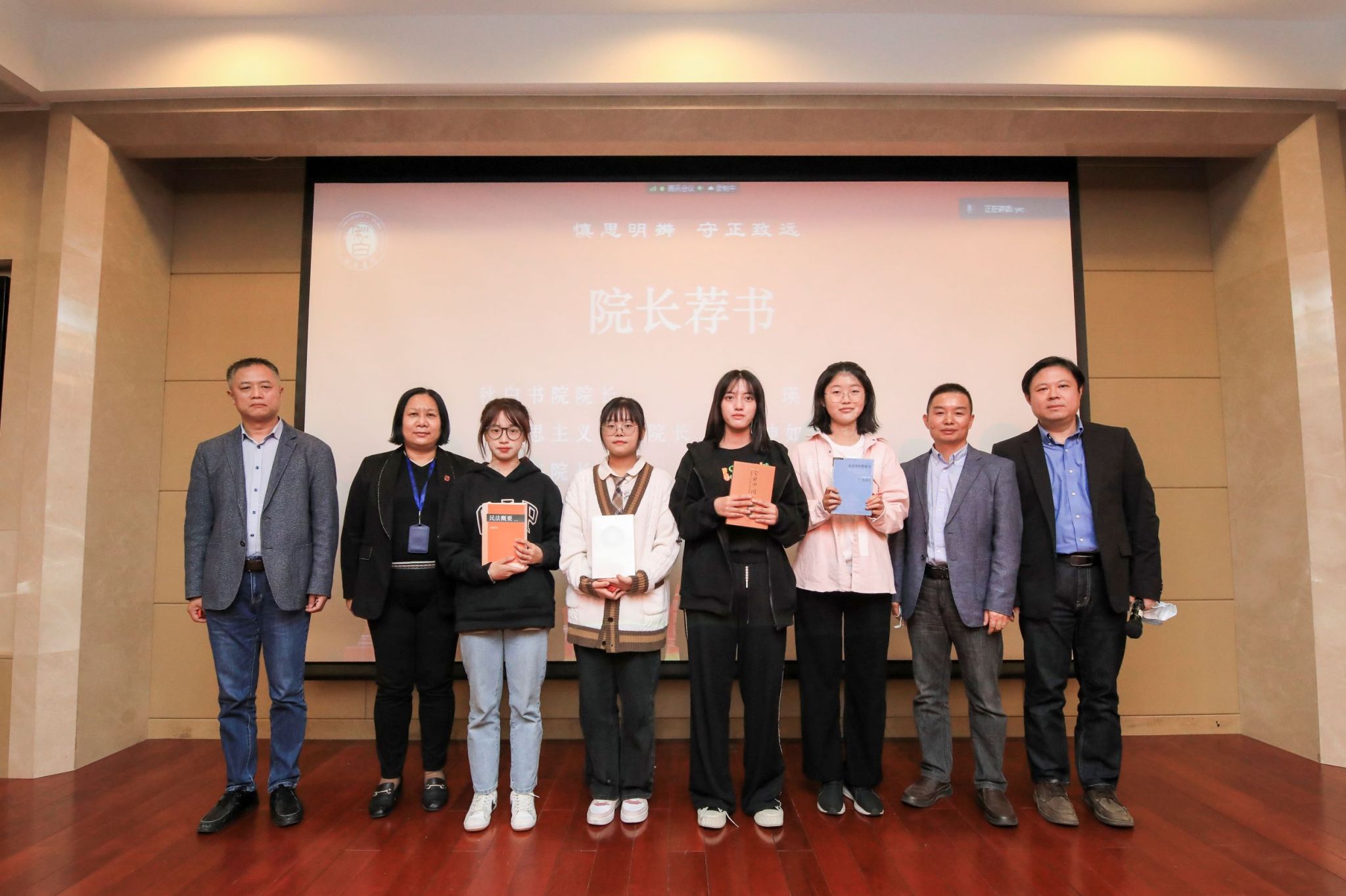 “红色传承、经典阅读、实践育人”是秋白书院的育人特色。在院长荐书环节,秋白书院院长肖瑛、马克思主义学院院长闫坤如、法学院院长李凤章、社会学院院长黄晓春分别向同学们推荐经典书目,激励秋白学子多读书、读好书,努力成为德法兼修、慎思明辨的卓越创新人才,四位新生代表上台接受赠书。