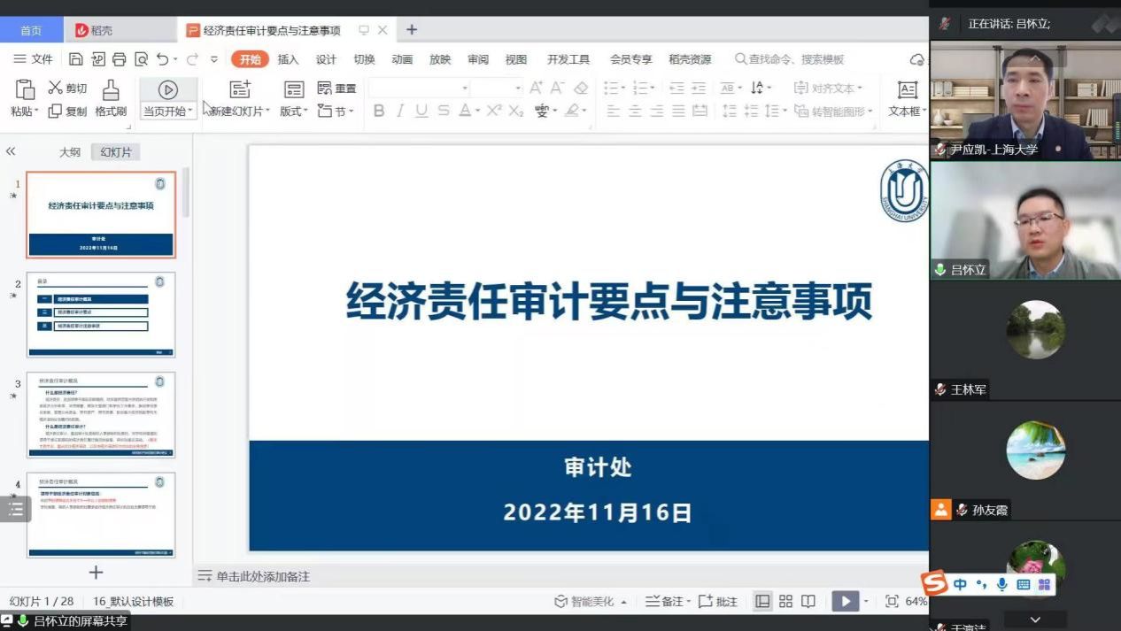 为增强领导干部对学校经济责任审计工作的认识,提高二级单位管理水平和内部控制质量,推动学校治理体系和治理能力的提升,11月16日上午,审计处组织召开主题为“金沙集团1862cc成色2022年经济责任审计要点与注意事项”的培训会。学校各二级单位正职领导、主持工作一年以上的副职领导参加了培训会,会议由审计处处长尹应凯主持,审计处副处长吕怀立担任主讲人。