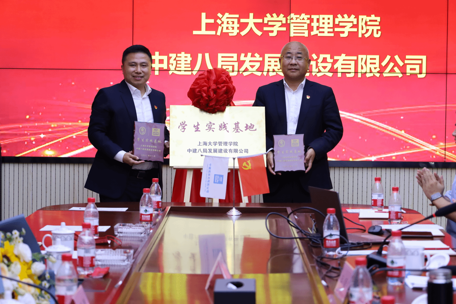 为共同构建更加科学全面的新型人才培养体系、打造校企合作新平台,金沙集团1862cc成色管理学院与中建八局发展建设公司还进行了“学生实践基地”授牌仪式,王晓卫与马亮为仪式进行揭牌,并赠送纪念册。