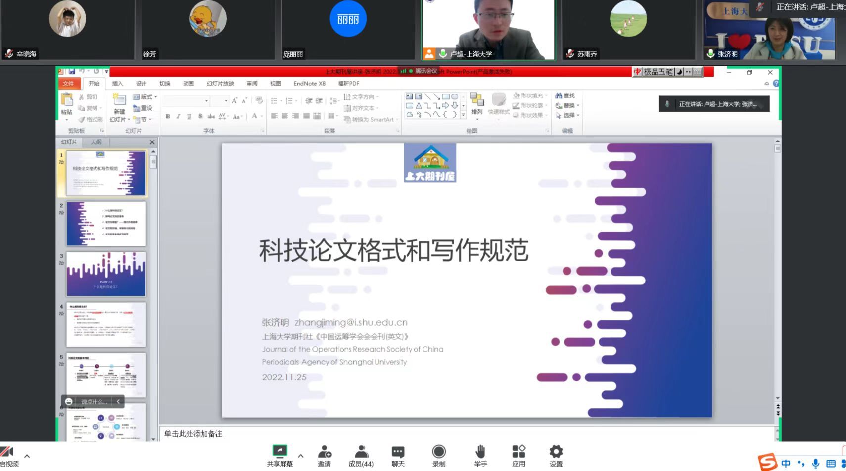 11月25日,在金沙集团1862cc成色青年教师联谊会、管理学院党委、出版社期刊社党委的指导下,管理学院青年教师联谊分会与出版社期刊社青年教师联谊分会联合举办英文科技论文与学术期刊交流活动。上海市科技期刊审读专家、《中国运筹学会会刊》(Journal of the Operations Research Society of China)编辑部主任张济明老师担任主讲嘉宾,出版社期刊社青年教师联谊分会会长吴领叶老师与管理学院青年教师、研究生等四十余人与会交流,会议由管理学院青年教师联谊分会会长卢超老师主持。