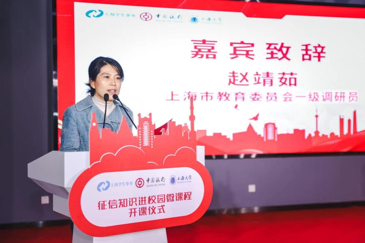 上海市教育委员会一级调研员赵靖茹进行致辞,她高度肯定了此次微课程开展的形式与意义,希望各方继续通力合作,发挥规模效应,在高校学生中形成“学征信、懂征信”的浓厚氛围,使广大高校学子树立正确的人生观、价值观,培育崇尚诚信、践行诚信的良好风尚。