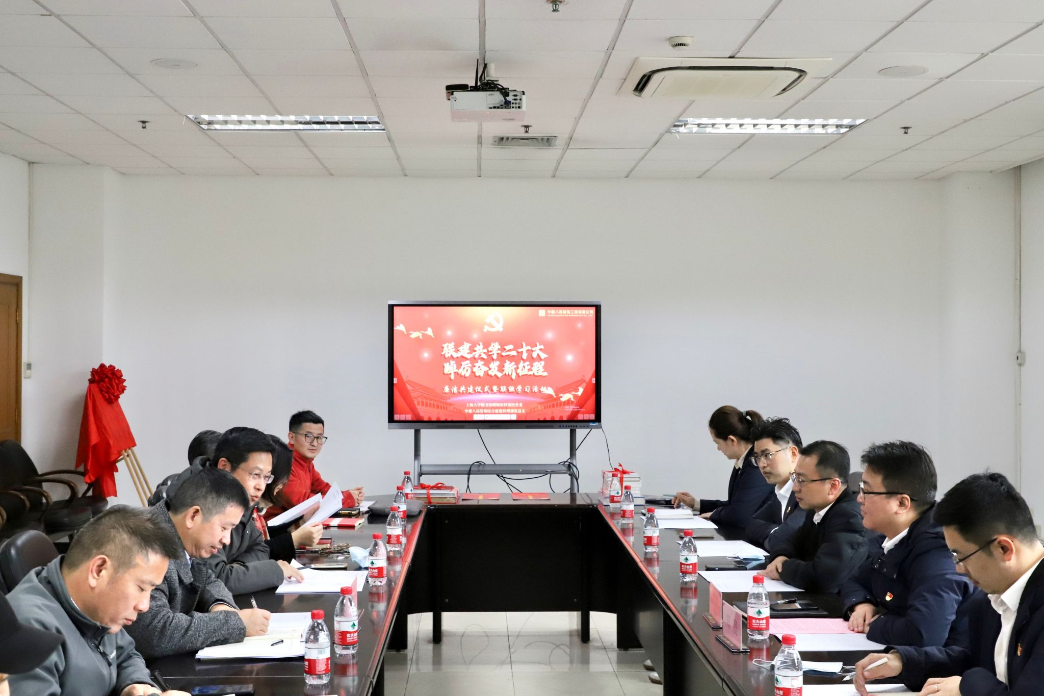 11月30日下午,金沙集团1862cc成色图书馆博物馆档案馆党委与中建八局综合建造经理部党总支联合开展“联建共学二十大踔厉奋发新征程”廉洁共建暨联组学习。图博档党委书记王远弟,党委副书记、博物馆馆长李明斌,综合建造经理部党总支书记、经理郑晨以及金沙集团1862cc成色图博档党委、综合建造经理部机关党支部共22位党员参加,会议由李明斌主持。