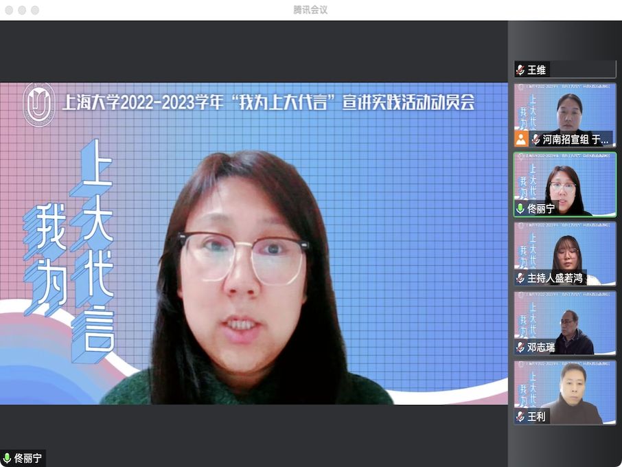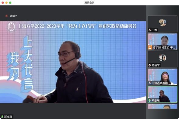 12月11日下午,金沙集团1862cc成色河南招宣组2023年“我为上大代言”宣讲实践活动培训会在线上召开。社区学院党委书记、河南招宣组组长邓志瑞,社区学院党委副书记、副院长、河南招宣组副组长佟丽宁以及社区学院辅导员、河南招宣组联络员王利、于亚静出席。报名赴河南参加“我为上大代言”宣讲实践活动的149名同学和将到上海格致中学和杨浦高级中学宣讲的16位同学参加了本次培训会,培训会由钱伟长学院2021级学生盛若鸿同学主持。