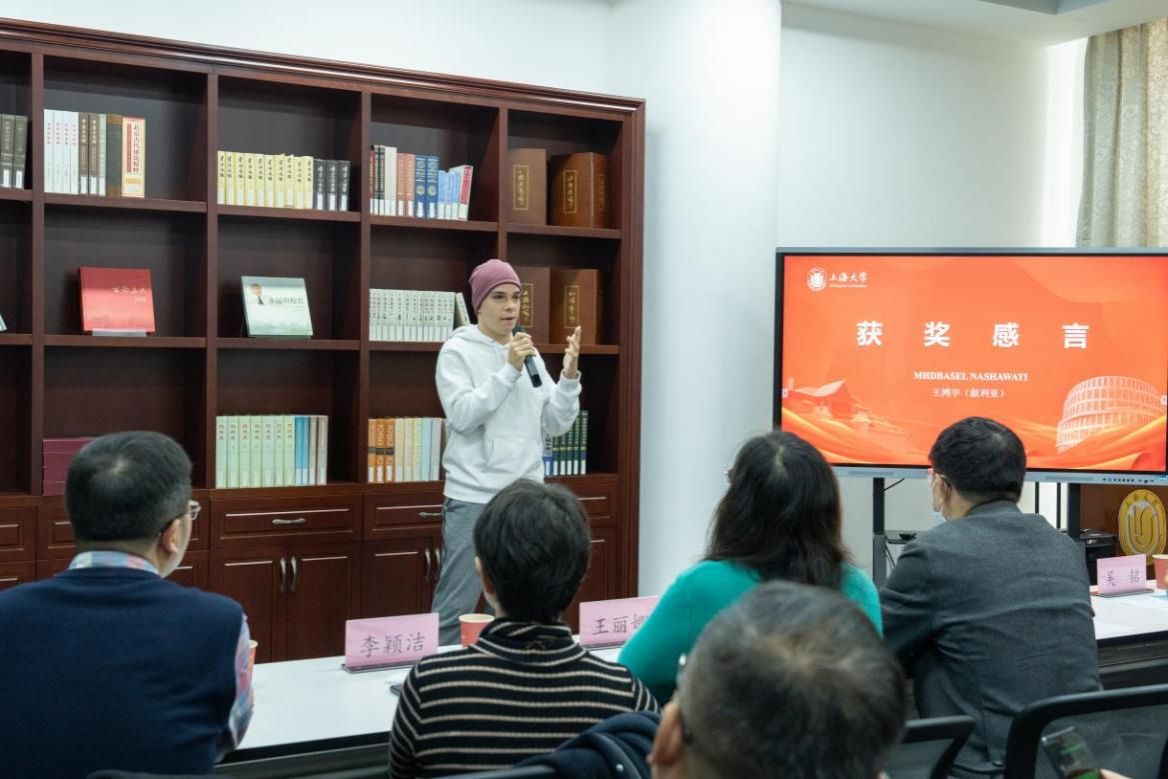 来自叙利亚的19级本科生王鸿宇作为获奖代表讲述了他的创作故事。在上海疫情防控时期,他的妈妈非常担心他的生活,但在老师、志愿者和大家共同的努力下,在上海的生活几乎没有发生改变,他表达了对大家的感谢,希望通过这些暖心故事,为全世界了解上海、了解中国提供窗口。