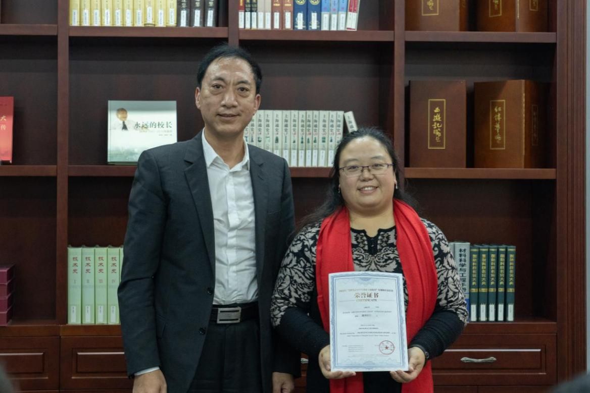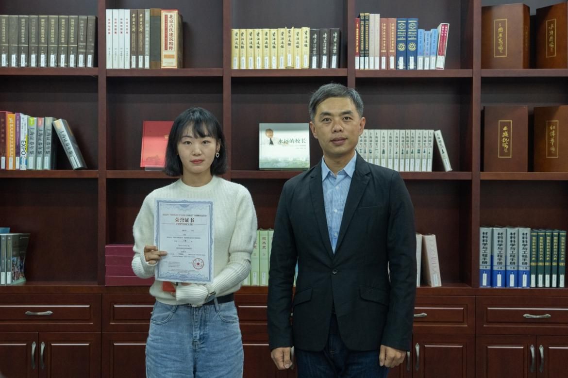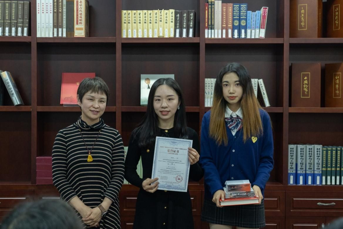 国际教育学院院长李颖洁为二等奖获奖团队颁奖,由于主创团队在境外无法领奖,文学院国际学生辅导员郭鸣代为领奖。