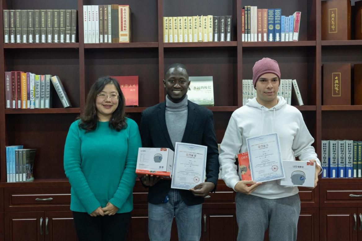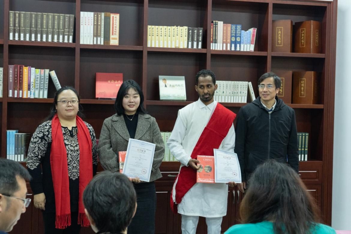 国际部党委书记王丽娜为一等奖获奖同学管理学院王鸿宇(叙利亚)、通信学院马杜(塞内加尔)颁奖。