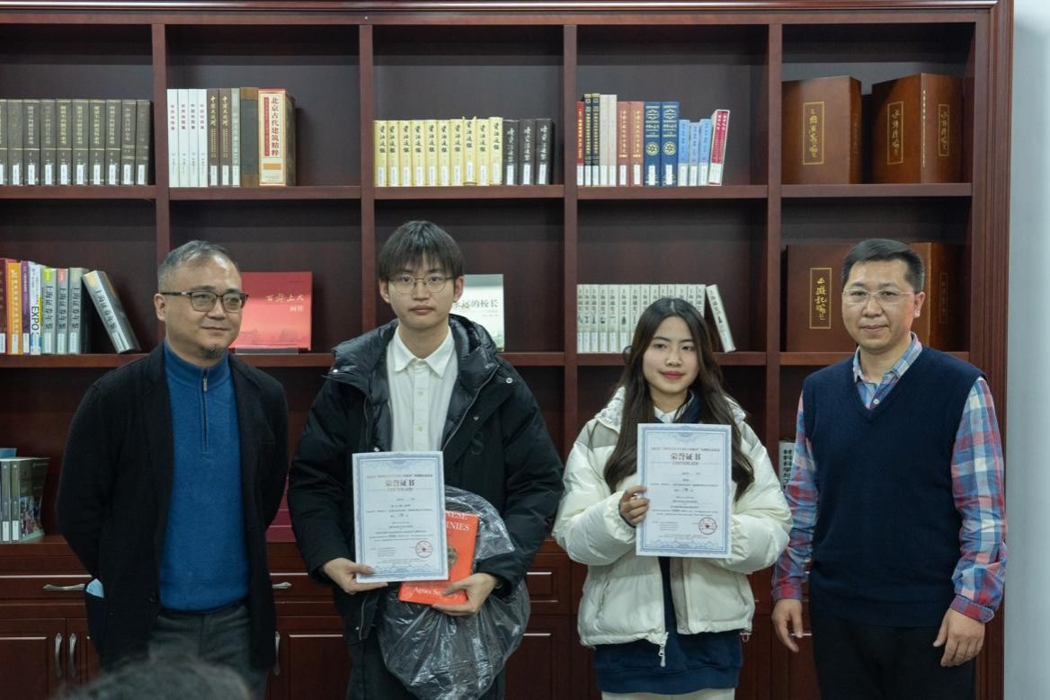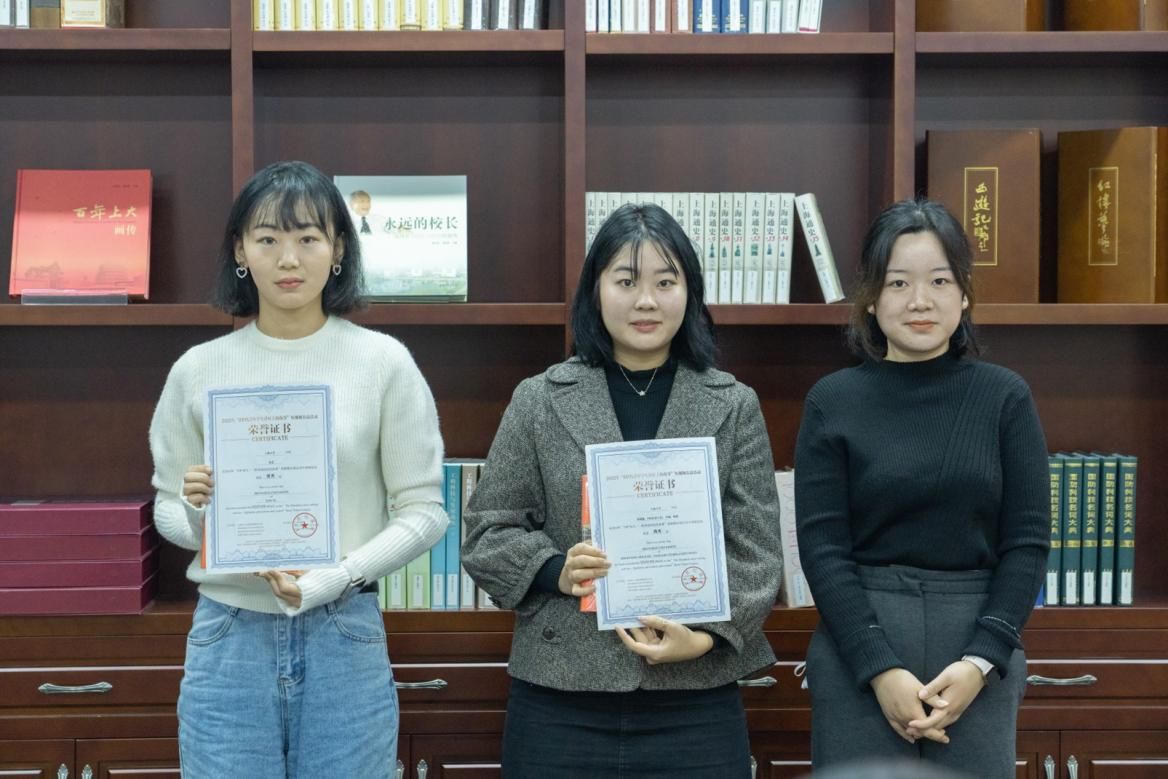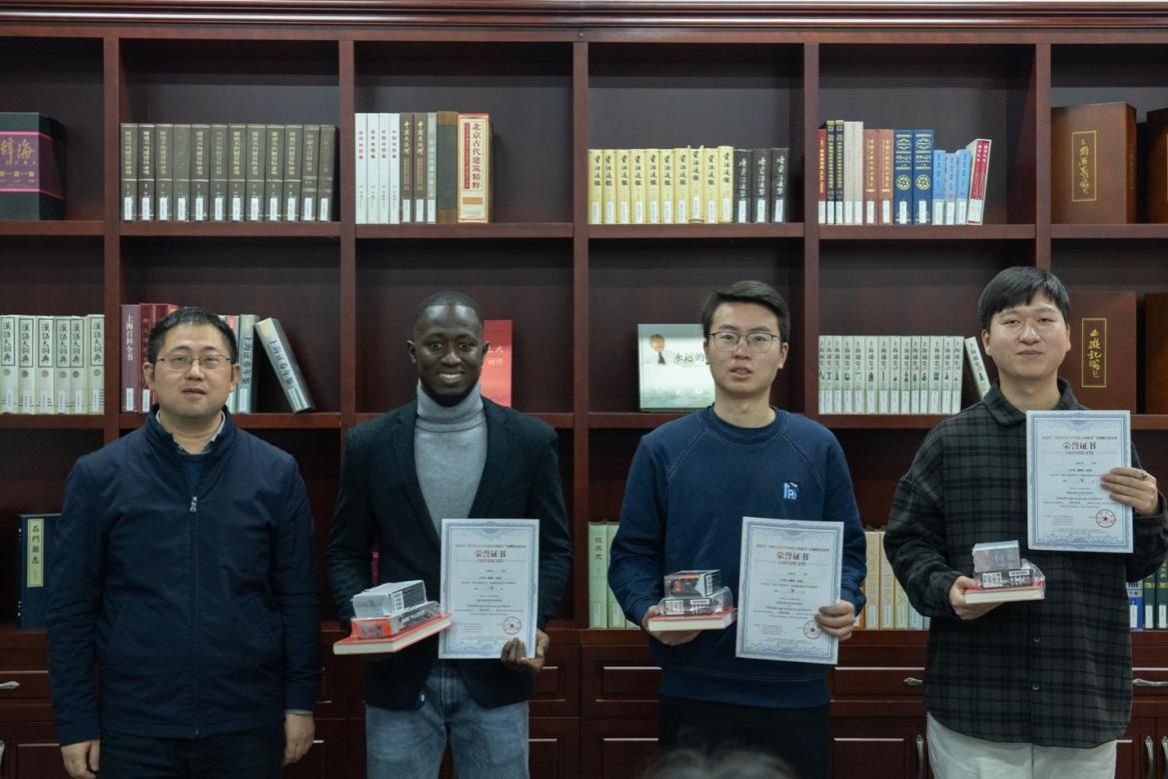 宣传部副部长、融媒体中心主任吴铭为二等奖获奖代表通信学院马杜(塞内加尔)、电影学院天海自由创(日本)、新闻与传播学院石生辉颁奖。