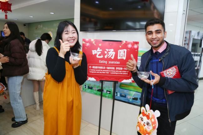 国际学生服务中心也端来准备好的“元宵”(汤圆),国际学生纷纷前来品尝美味,并情不自禁地在镜头前大声送上“元宵快乐!”中外师生们热情地合影留念,互道祝福。