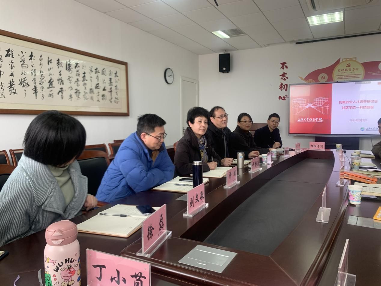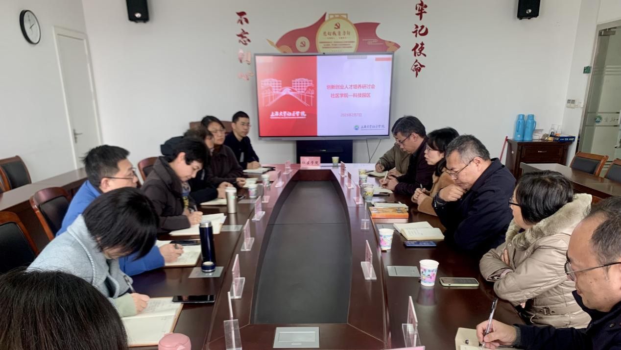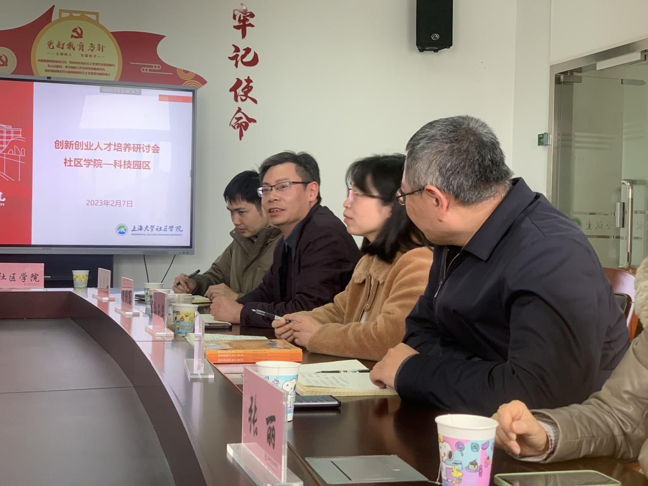 2月7日下午,金沙集团1862cc成色科技园区领导一行来社区学院就合作培养创新创业人才进行研讨交流。学校科产系统党委副书记孙玉华、科技园区副总经理劳剑东、科技园区副总经理岳中岳、创业部经理张丽、创业部主管黄泽军及社区学院全体领导班子和有关部门负责人参加了会议。