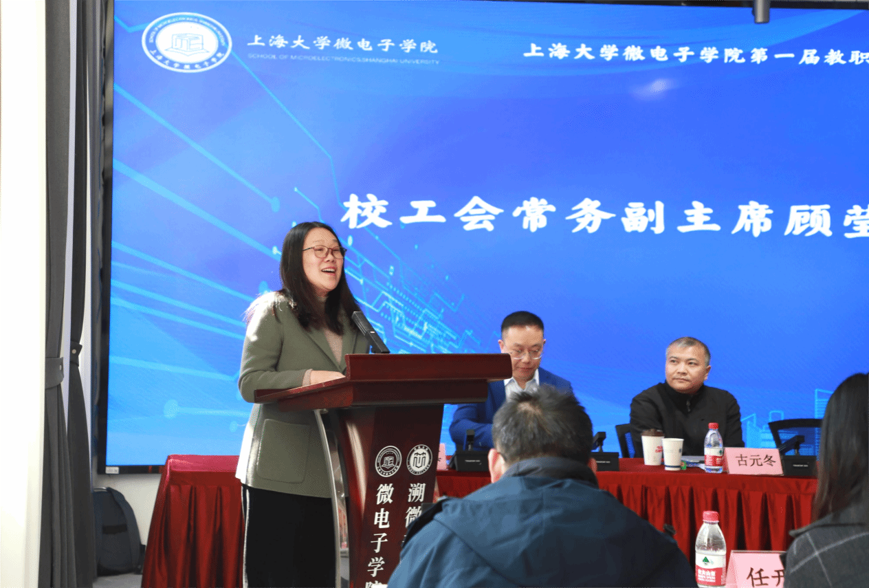 顾莹在致辞中对学院此次会议的召开表示热烈祝贺。她指出,教职工大会是学校治理体制的重要组成部分,是教职工行使民主权利、依法参与校院民主管理和民主监督的基本制度和基本形式,是团结凝聚教职工为学校与学院发展献计献策的重要载体。她希望微电子学院以此次会议为契机,继续深入学习贯彻党的二十大精神,积极践行党的群众路线,将党的方针政策、依法治校与民主管理的要求进一步落实到学院的建设发展过程中。她号召学院每位教职工都能以主人翁的状态,更好地把自身的发展与学院的建设紧密结合起来,努力实现个人发展与学院建设的双飞跃。