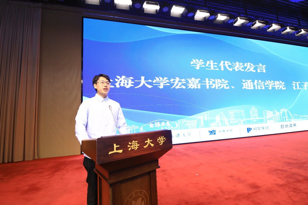 宏嘉书院、通信学院21级大数据专业本科生江子恒作为学生代表发言,分享了他十年的网文阅读经历和感悟。
