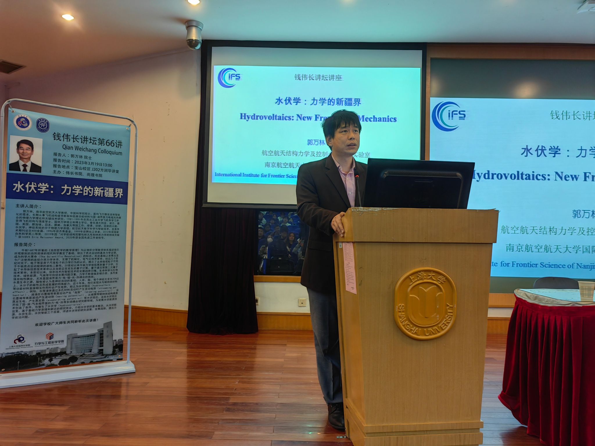 3月19日下午,钱伟长讲坛第66讲《水伏学:力学的新疆界》暨2022-2023学年春季学期首日教育在金沙集团1862cc成色宝山校区J楼202方润华讲堂举行。本次讲座有幸邀请到中国科学院院士、南京航空航天大学郭万林教授担任主讲,本次讲座由钱伟长学院、力学与工程科学学院共同主办。力学与工程科学学院党委副书记、院长张田忠,钱伟长学院党委书记吴蔚,党委副书记、院长周全,党委副书记、副院长沈青松,副院长许新建,副院长任伟以及钱伟长学院、力学与工程科学学院、材料基因组工程研究院的师生共同聆听了此次讲座。讲座由钱伟长学院副院长任伟主持。