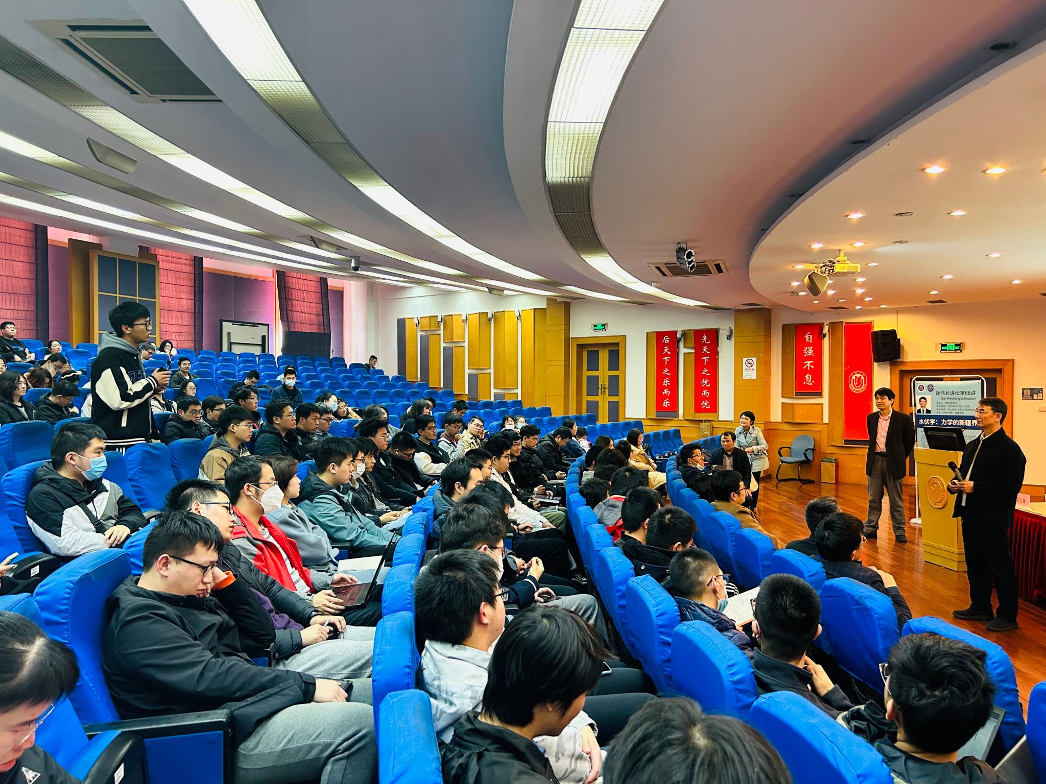 在主题互动交流环节,学生代表夏智霖、夏琰等多位同学踊跃提问,郭院士逐一耐心进行了交流和回应。他鼓励同学们要勇于打破学科界限,从研究问题出发,积极开展科研工作,“一辈子一定要努力做好一两件有意义的大事”。讲座结束后,周全院长和学生代表分别向郭万林院士敬献了钱伟长讲坛水晶杯和鲜花,以此表达全体师生对郭院士的诚挚感谢和由衷敬意。