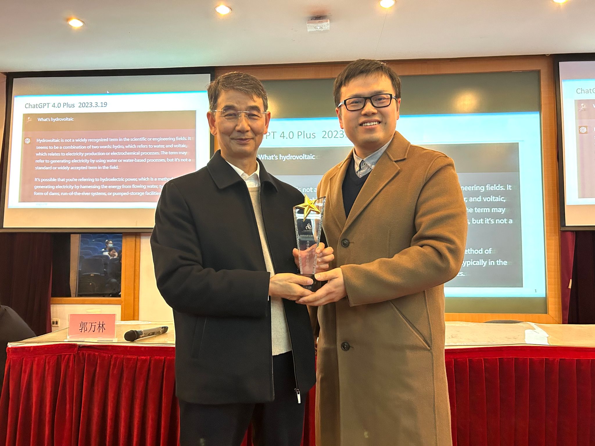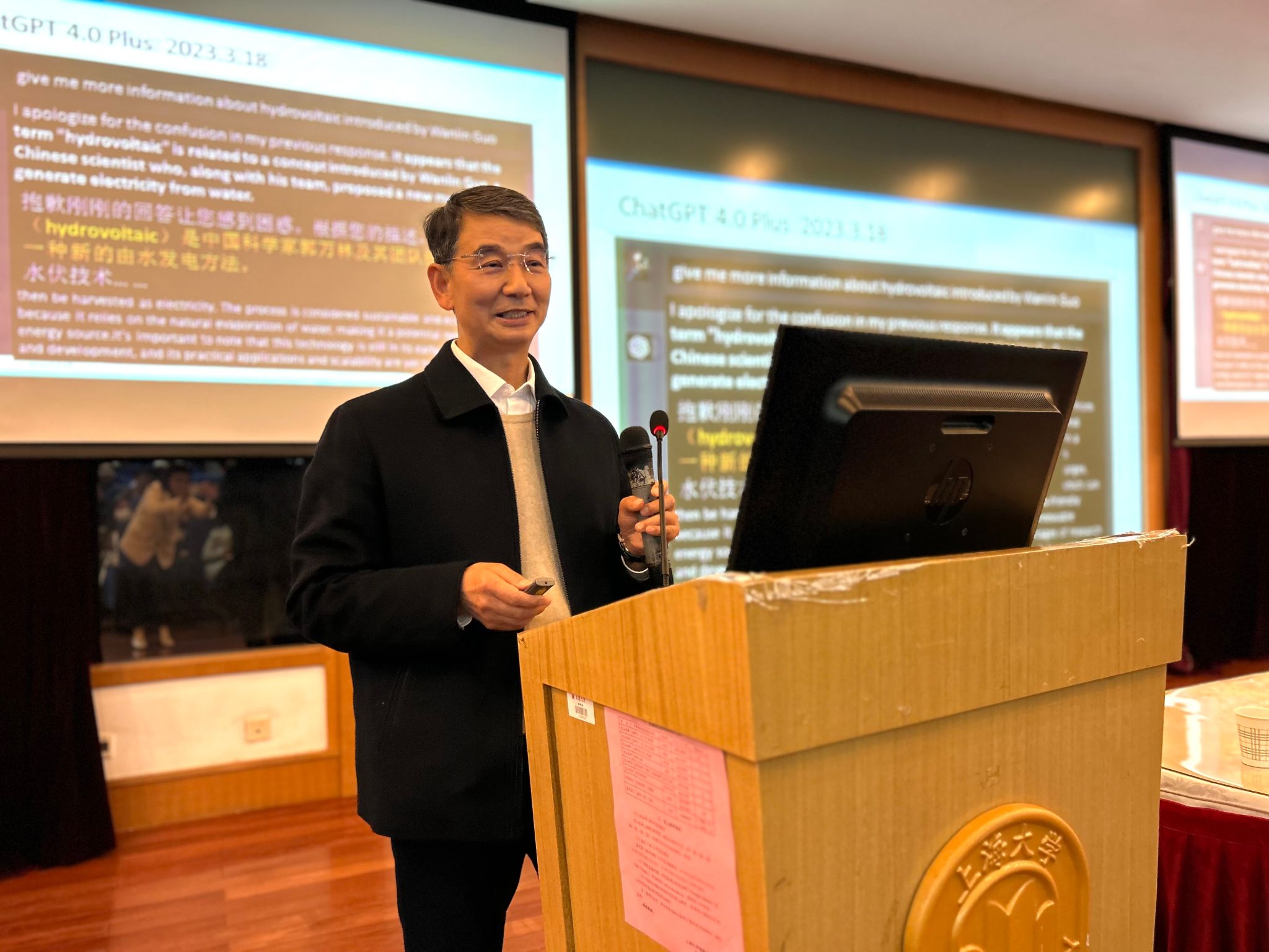 随后,郭院士介绍了自己目前从事的水伏学研究。他指出,水分子的极性及形成氢键的特殊能力,使得其与碳纳米材料等功能材料直接相互作用时会产生电势,这称之为水伏效应(hydrovoltaic effect)。例如,水等液体通过多孔材料流动时产生流动电势(streaming potential)、液滴在石墨烯等表面运动产生“曳势”(drawing potential)、沿石墨烯等表面波动产生波动势(waving potential)、从碳黑等碳纳米结构表面蒸发生电、产生蒸发势(evaporating potential)等水伏效应。这些水伏效应开拓了固-液-气多相界面的力-电-热等多场耦合研究新领域,为发展水伏能源技术创造了条件,也催生了水伏学(hydrovoltaics)。在介绍了水伏学的基本概念之后,郭院士从水伏能源、水伏生态、水伏智能三个方面,评述了水伏学的研究进展和发展趋势。在水伏能源方面,郭院士通过一系列数据说明了利用水伏效应来发电可以供应整个地球人类所需的能源的潜力。在水伏智能方面,郭院士谈到了脑电与水伏效应存在联系的可能性,并对水伏学的未来以及力学的前沿问题进行了展望。此外,郭院士还介绍了自己培养的研究生和本科生的科研经历,尤其是一些本科生在他的鼓励指导下参与研究,拓展了2021年诺贝尔物理学奖得主所建的气候模型,考虑水汽随气温的耦合动态分布对气候变暖的影响。由此鼓励现场的同学们在本科阶段多主动参与科学研究,思考重要的科学问题。