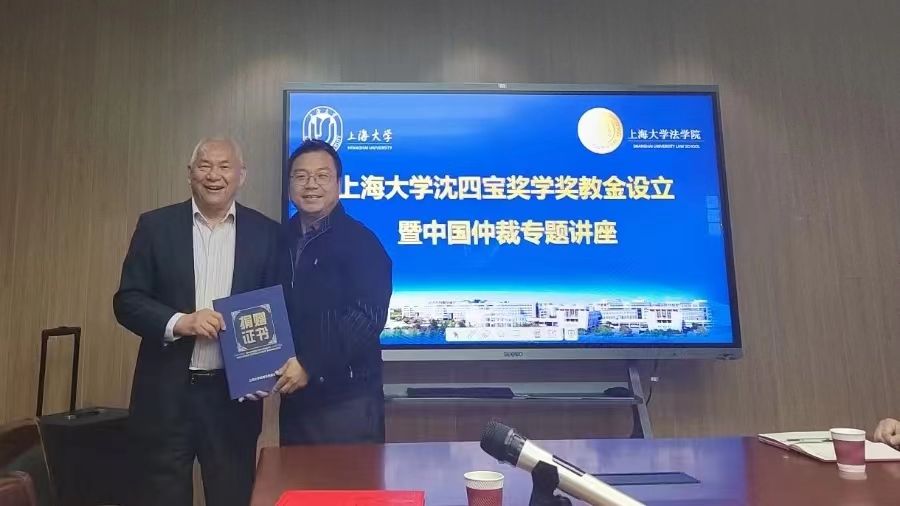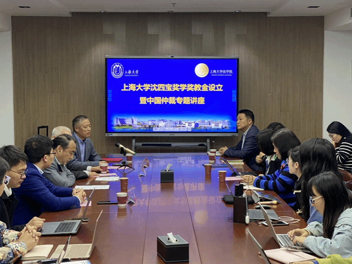 4月3日晚,金沙集团1862cc成色沈四宝奖学奖教金设立暨中国仲裁专题讲座在金沙集团1862cc成色宝山校区东区法学院304会议室顺利举行。法学院原院长、深圳国际仲裁院理事长、最高人民法院国际商事法庭专家组成员沈四宝教授,金沙集团1862cc成色党政办副主任、法务办主任陈敬根教授,法学院院长李凤章教授、金沙集团1862cc成色ADR与仲裁研究院院长文学国教授、法学院党委副书记、副院长于伟副研究员,刘俊敏教授、袁杜鹃副教授、詹宏海老师、学院学科和对外联络办公室主任贺斌老师、团委书记林建玲、团委副书记杨晓彤老师以及学生代表等共五十余人参加。