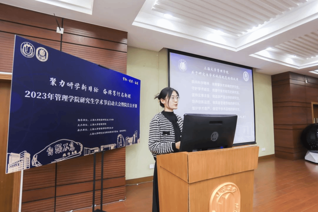 2021级企业管理研究生赵文静作为研究生代表领誓,带领全体同学共同发出研究生学术规范的时代宣言。庄严的宣誓仪式和坚定的宣誓话语,体现了同学们赓续管院研究生学子科研实践的追求和携手共创管院研学新篇的决心。