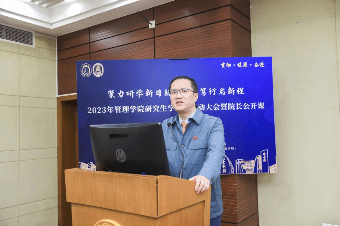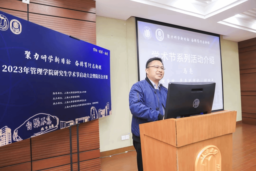 管理学院党委副书记、副院长马亮对2023年管理学院研究生学术节系列活动展开介绍。活动共分为四个板块,分别为启动大会暨院长公开课、奋进研途•导学共创交流会 、聆听强音•业界大咖分享会、携手共进•优秀学子畅谈会。他指出通过学术节能够凝聚大家的智慧,分享经验,激发同学们创新的活力,成为管院学子跨学科交流的平台,同时希望同学们能够秉承自强不息的精神,为学院与学校的发展贡献管院的智慧,展现管院的风采。
