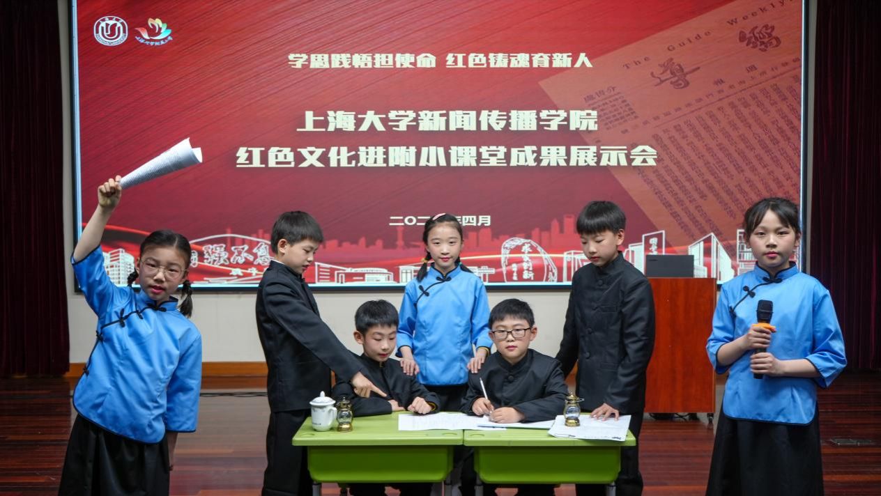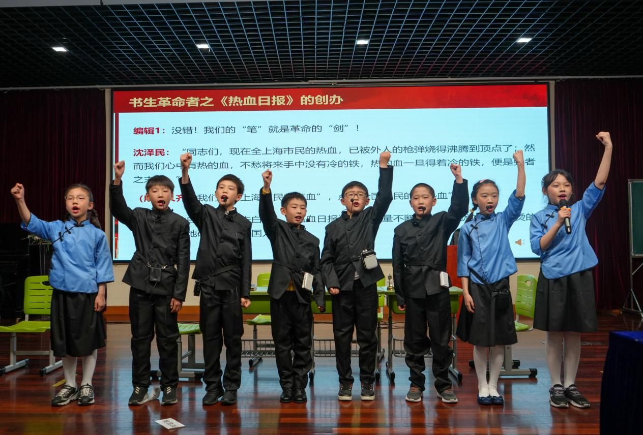紧接着,金沙集团1862cc成色附属小学四年级学生进行了《书生革命者之<热血日报>创办》的情景剧表演,重现瞿秋白等人在上海创办《热血日报》慷慨无畏、不断抗争的故事情节。“我们心中有热的血,不愁将来手中没有冷的铁,热的血一旦得着冷的铁,便是强者之末运!”热血日报的创刊词久久回响在成果展示会的会场中。