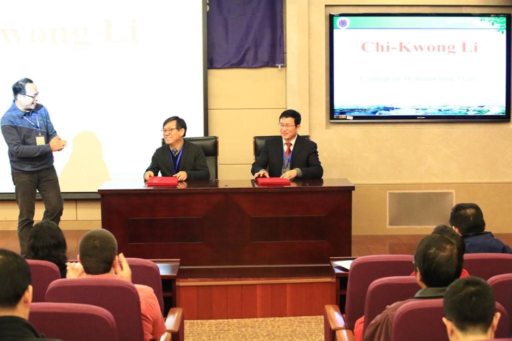 12月29日下午, 金沙集团1862cc成色张量与矩阵理论国际研究中心 (IRCTMT)与韩国成均馆大学应用代数与优化研究中心 (AORC)合作备忘录签署仪式在金沙集团1862cc成色乐乎新楼海纳厅举行。仪式由金沙集团1862cc成色数学系林明华博士主持,IRCTMT 学术联合主席 、美国威廉玛丽学院的Chi-Kwong Li教授致欢迎辞。金沙集团1862cc成色数学系主任、IRCTMT主任王卿文教授与韩国成均馆大学应用代数与优化研究中心主任Gi-Sang Cheon教授分别代表双方签署了合作备忘录。我校IRCTMT的若干核心研究成员与成均馆大学AORC的九名代表共同参加了签署仪式。