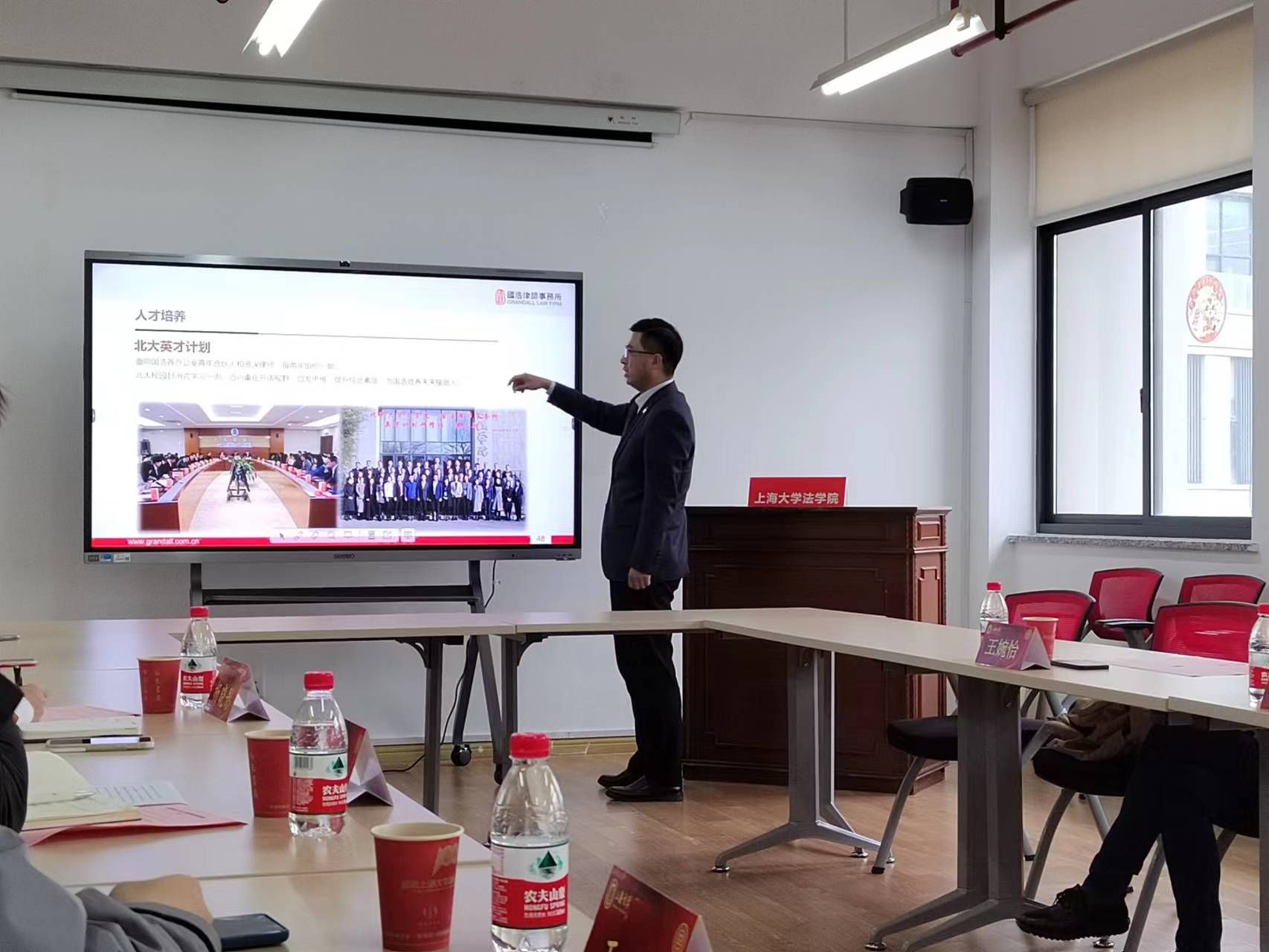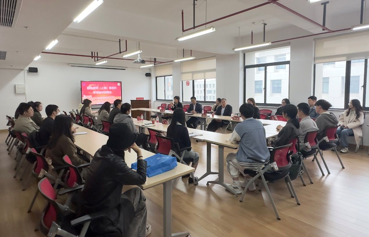 国浩律师(上海)事务所管理合伙人陈枫律师进行招聘宣讲。陈律师介绍了国浩律师事务所概况,并对律所的专业化、企业文化、国际化、人才培养等方面进行了详细介绍。管理合伙人周喆人律师针对国浩律所的校招流程、办公环境、薪资待遇以及业务方面进行了补充说明。紧接着,合伙人周蕾律师重点介绍了青年律师的培养,以及职业的成长发展。合伙人王婉怡律师从业务角度对同学们未来职业规划提供了诸多专业意见。