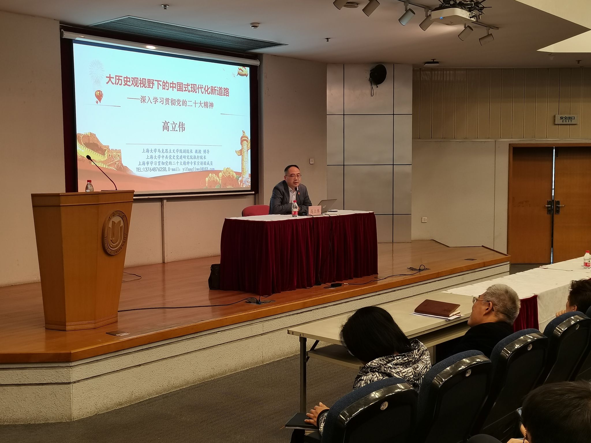 随后,上海市主题教育讲师团、上海市教卫工作党委讲师团成员,金沙集团1862cc成色马克思主义学院教授高立伟作了题为《大历史观视野下的中国式现代化新道路》的报告。高立伟教授在大历史观和大时代观视野下,多层次多角度解读了“中国式现代化”的理论体系,使机关党员、干部对党的二十大精神有了更深层次的理解和认识。