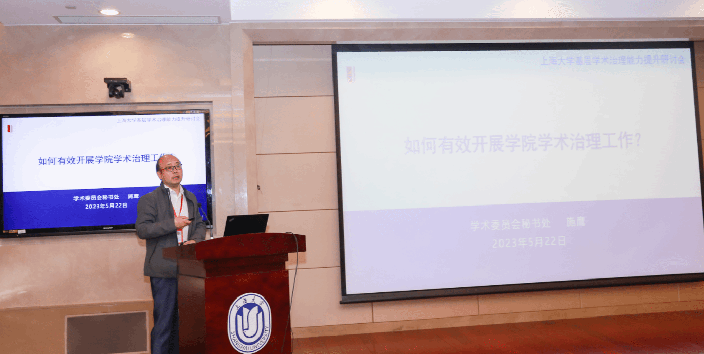 秘书长施鹰作了《如何有效开展学院学术治理工作》的报告。他从学术治理体系架构、分委员会工作要点和学风建设工作三个方面,阐述了现代大学制度中学术治理体系的重要性和学术委员会的重要地位,详细介绍了我校“1+9+28”的学术治理架构以及学风建设工作进展,对如何进一步推进学院学风建设工作、科研诚信教育提出了工作要求,并通过面对面交流的方式征询了学院对我校学术治理工作的有关意见和建议。