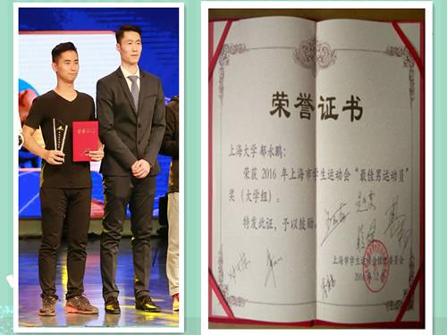 两年多来,在我校体育学院陈琳和陈婷两名教练员的精心指导下,郁永鹏同学发扬自强不息的校训精神,刻苦训练,发愤图强,不断提升自己的竞技水平,同时把体育精神融入学习和校园生活中来,不断影响着身边的上大学子们;在指导同学进行锻炼的同时,也让大家体会到运动和学习所带来的快乐。