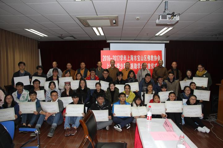 随后,世良法师代表区佛协向金沙集团1862cc成色捐款,上大统战部李青副部长、上大民族联安平副主任代表校方接受捐款并授捐赠证书。宝山区9所寺院的监院分别为40名受助学生颁发助学证书。