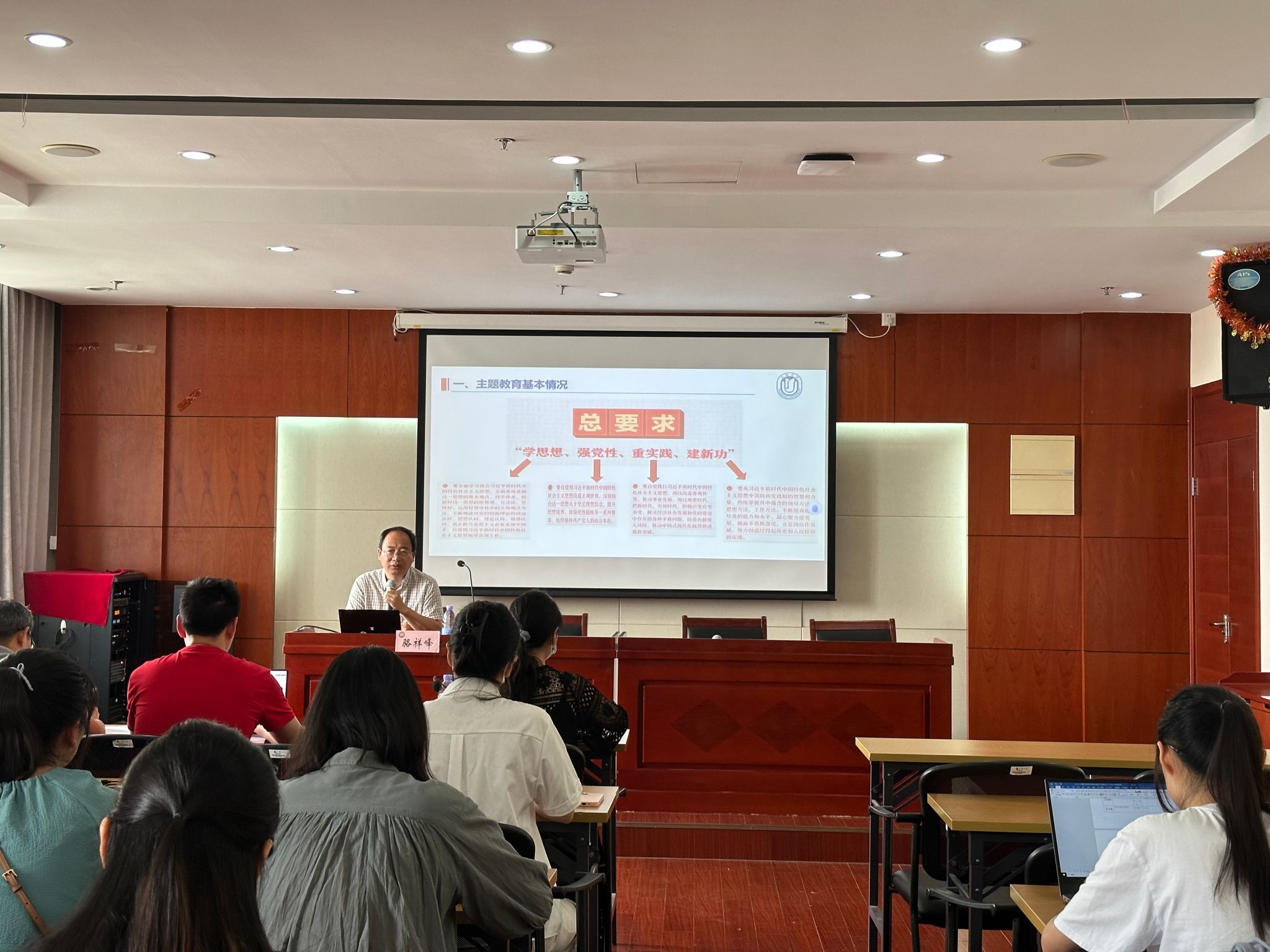 副院长骆祥峰以“把握主题教育总要求,锤炼专业本领,助力科技自立自强”主题为计算机学院研究生党员讲授党课。教工党支部委员代表陈圣波、研究生辅导员王明歌、郑丽玫、唐明与百余位研究生党员代表参与本次党课学习。