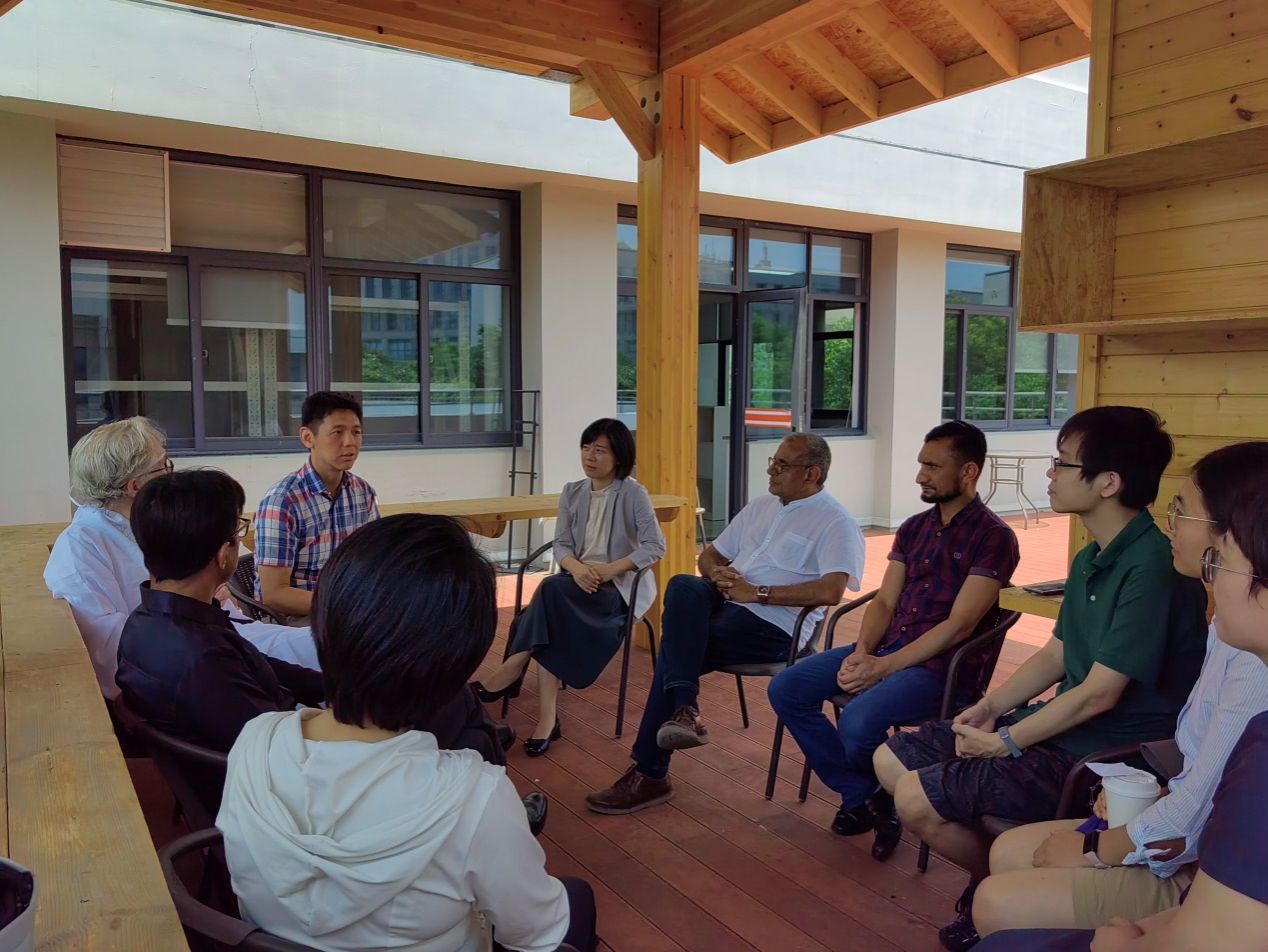 之后,外教们参观了宝山校区土木楼二楼的“小林荫”木廊亭,并与木廊亭构建者舒展老师深入交流。木廊亭充分展现了我校师生对低碳建筑和可持续发展的理念构思与实践探索。对中外建筑的生态概念和文化呈现外籍教师们展开了热烈讨论。