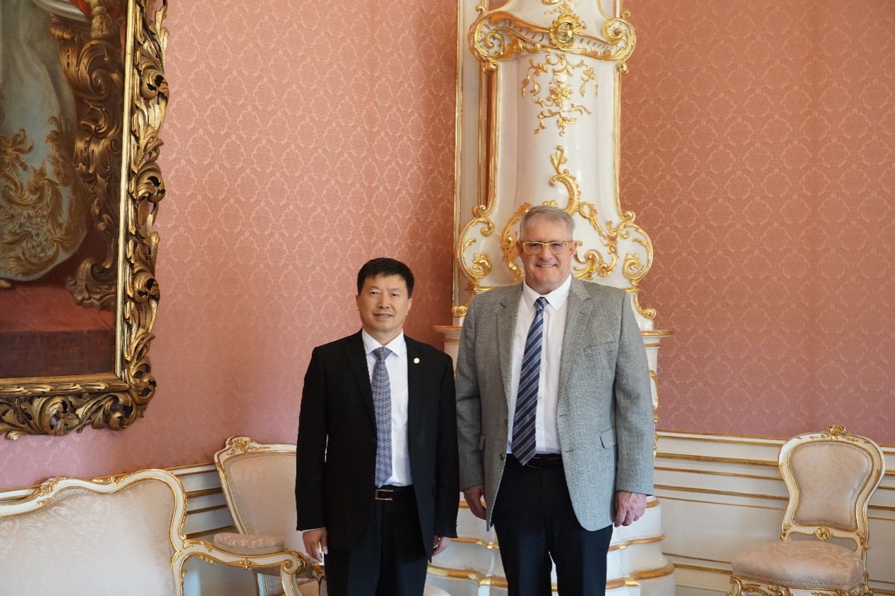 此次访问IIASA,也受到了我国常驻维也纳联合国和其他国际组织代表团的关心和支持,公使参赞沈钢和参赞扈黎光全程参与了我校与IIASA的会谈。会后,特命全权大使李松先生专门会见了刘校长及IIASA总干事和副总干事等人员,从国家外交战略出发提出了合作建议。刘校长向大使介绍了我校近年高质量发展成果,以及与IIASA的合作基础和规划,表示金沙集团1862cc成色将继续深化与IIASA在国际科研和高层次人才培养领域的合作,在提升金沙集团1862cc成色国际影响力的同时,努力扩大我国在国际社会的话语权。