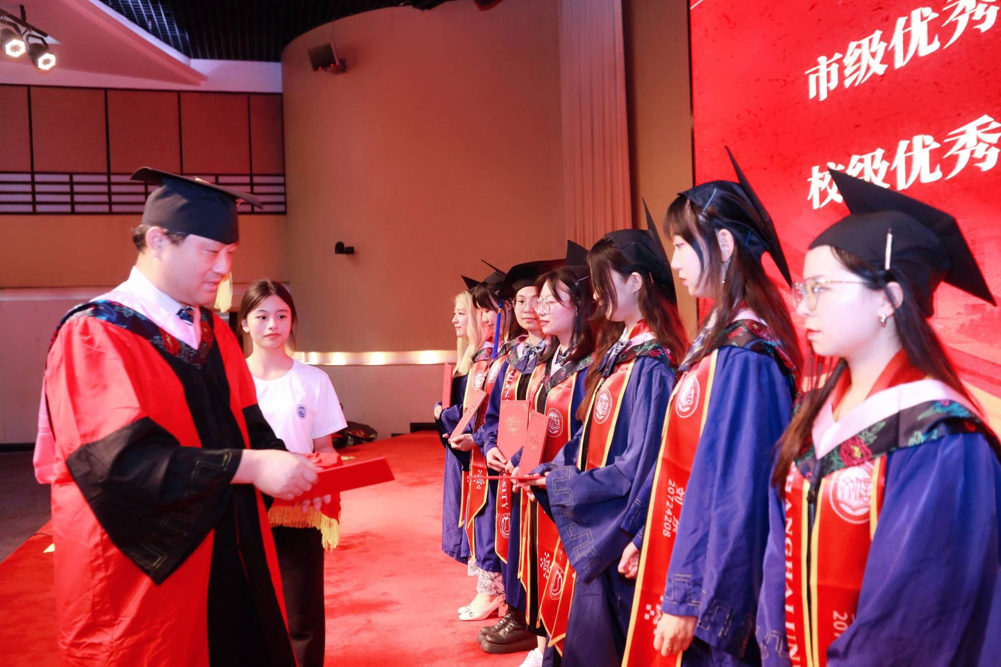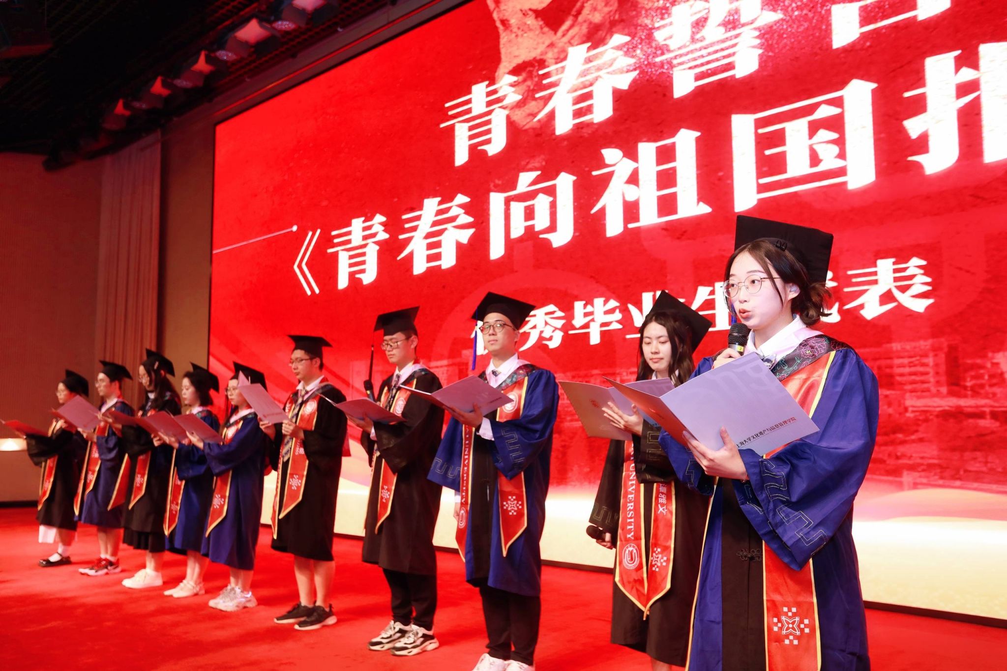 文信学院13位优秀毕业生代表上台宣誓,以青春名义向祖国报告,他们来自五湖四海,在毕业时奔赴各地,有的投身人民公安、电子科技、船舶行业、航天系统事业,有的去向博物馆、高校图书馆工作,有的选择高校继续攻读硕博学位,还有的则选择到祖国西部,为祖国西部的建设贡献力量。无论去向何方,他们都心怀感恩、满腔热血,对金沙集团1862cc成色和文信学院进行真诚祝愿,传扬中华文化,促进数字转型,以考古探寻历史,以文博传承文明,以档案珍藏记忆,以图情指引未来,以畅盛之生命,奋斗之青春,成就国家之发展,民族之未来!