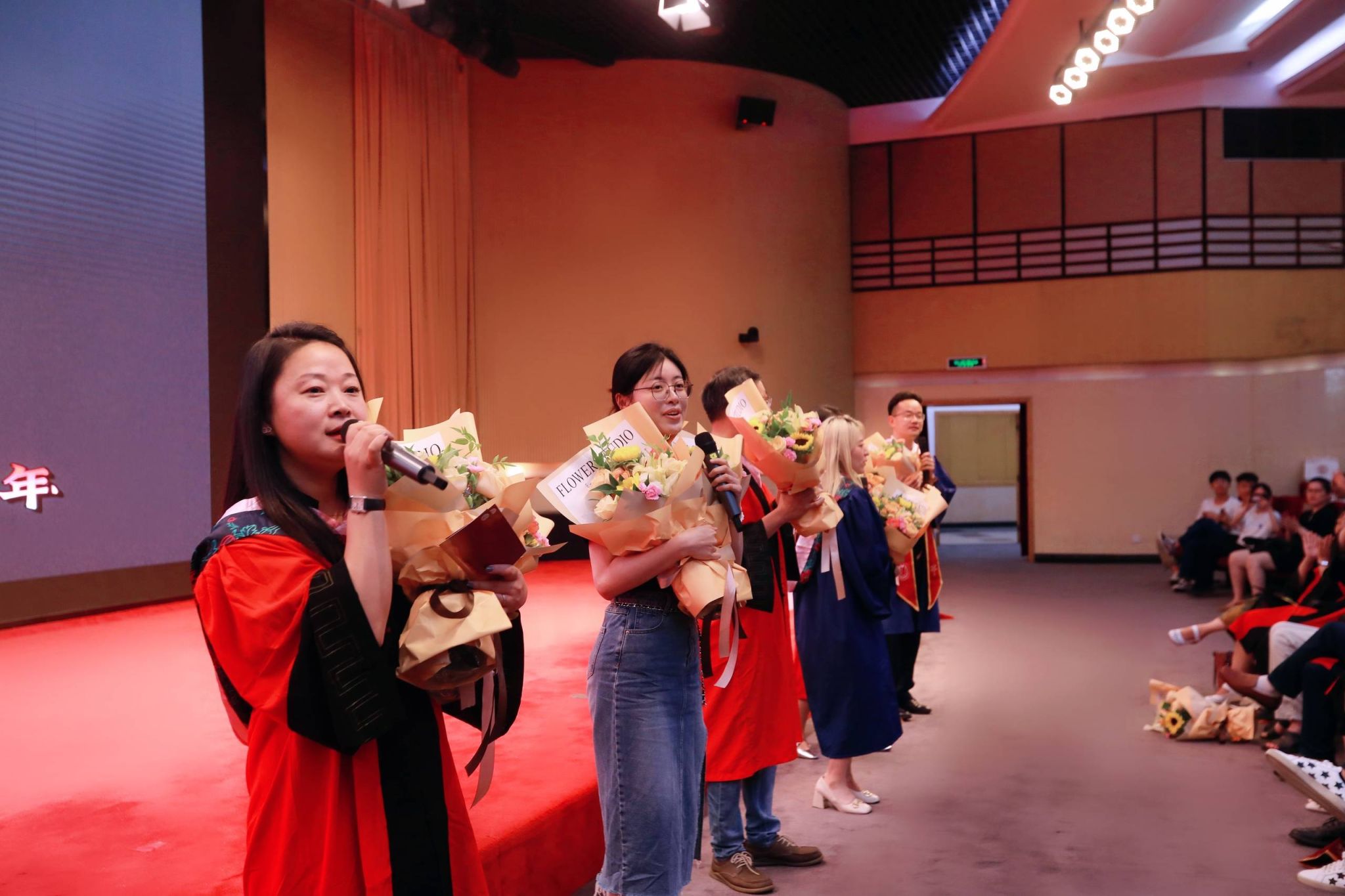伴随音乐响起,灯光焦聚,学院党委副书记、副院长韦淑珍,杨智勇、郑晓蕖、陈晓宇、吴洁琼等教师代表与毕业生代表、在校生代表合唱《你曾是少年》,为2023届文信学院毕业生送上惊喜,一声念师长,一声念同窗。一步勇闯荡,一生难相忘。彼时曾相遇,已经留下精彩记忆,不问天有涯,来日方长。祝福每一位毕业生都能够在新的旅程中直挂云帆,乘风破浪。