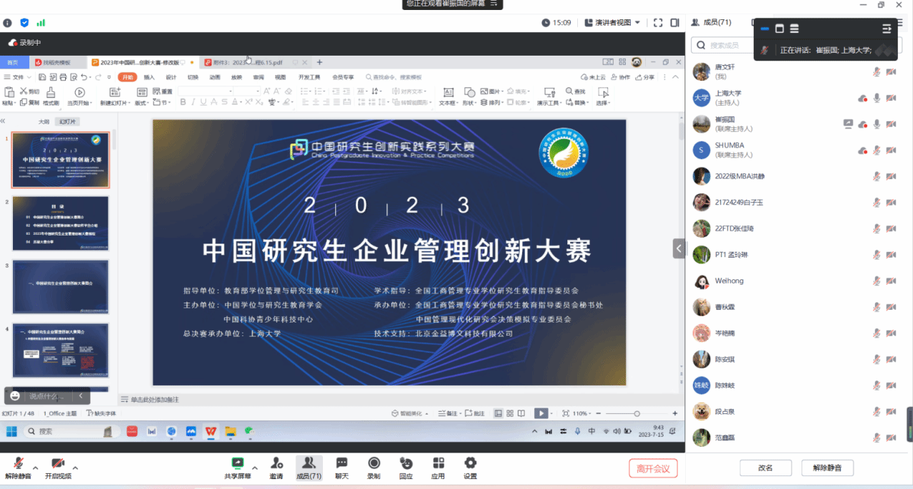 7月15日上午,金沙集团1862cc成色研究生企业管理创新大赛校内选拔赛宣讲培训会在线上顺利召开,金沙集团1862cc成色党委研究生工作部部长魏宏,管理学院党委副书记、副院长马亮,经济学院党委副书记、副院长冯玉鑫,全国企创大赛组委会工作组朱斌丹、崔振国、李金雨以及经济学院、MBA中心、管理学院、悉尼工商学院、法学院等学院的辅导员老师、参赛同学们共同参加本次宣讲培训会。