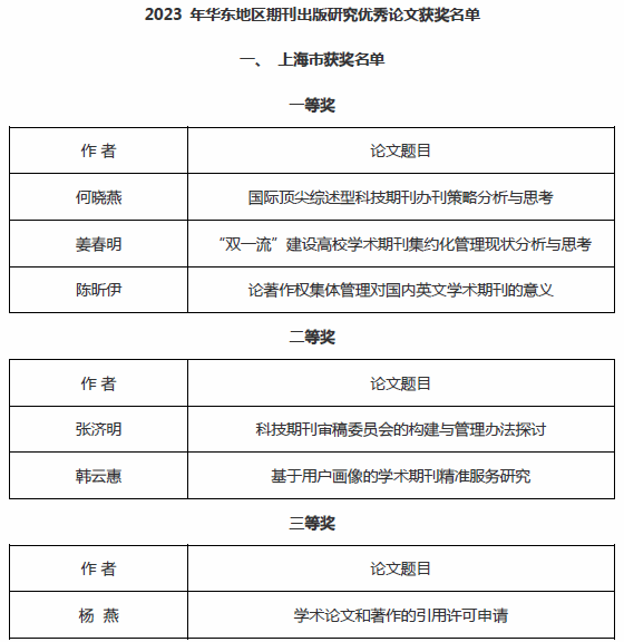 2023年华东地区期刊出版研究优秀论文评选活动由华东地区期刊协会联盟组织开展,经各省(市)期刊协会初评、推荐,华东地区期刊出版研究优秀论文评审委员会终评,共评选出一等奖39篇,二等奖57篇,三等奖96篇。其中,上海期刊获一等奖13篇,二等奖19篇,三等奖30篇。