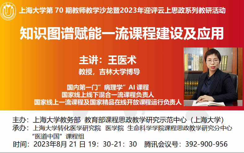 8月21日晚,金沙集团1862cc成色邀请吉林大学医学教育研究与教师发展中心业务副主任王医术教授作题为“知识图谱赋能一流课程建设及应用”的线上讲座。沙龙由教务部、教育部课程思政教学研究示范中心(金沙集团1862cc成色)主办,转化医学研究院、医学院、生命科学学院课程思政教学研究分中心、“医道中国”课程组联合承办。