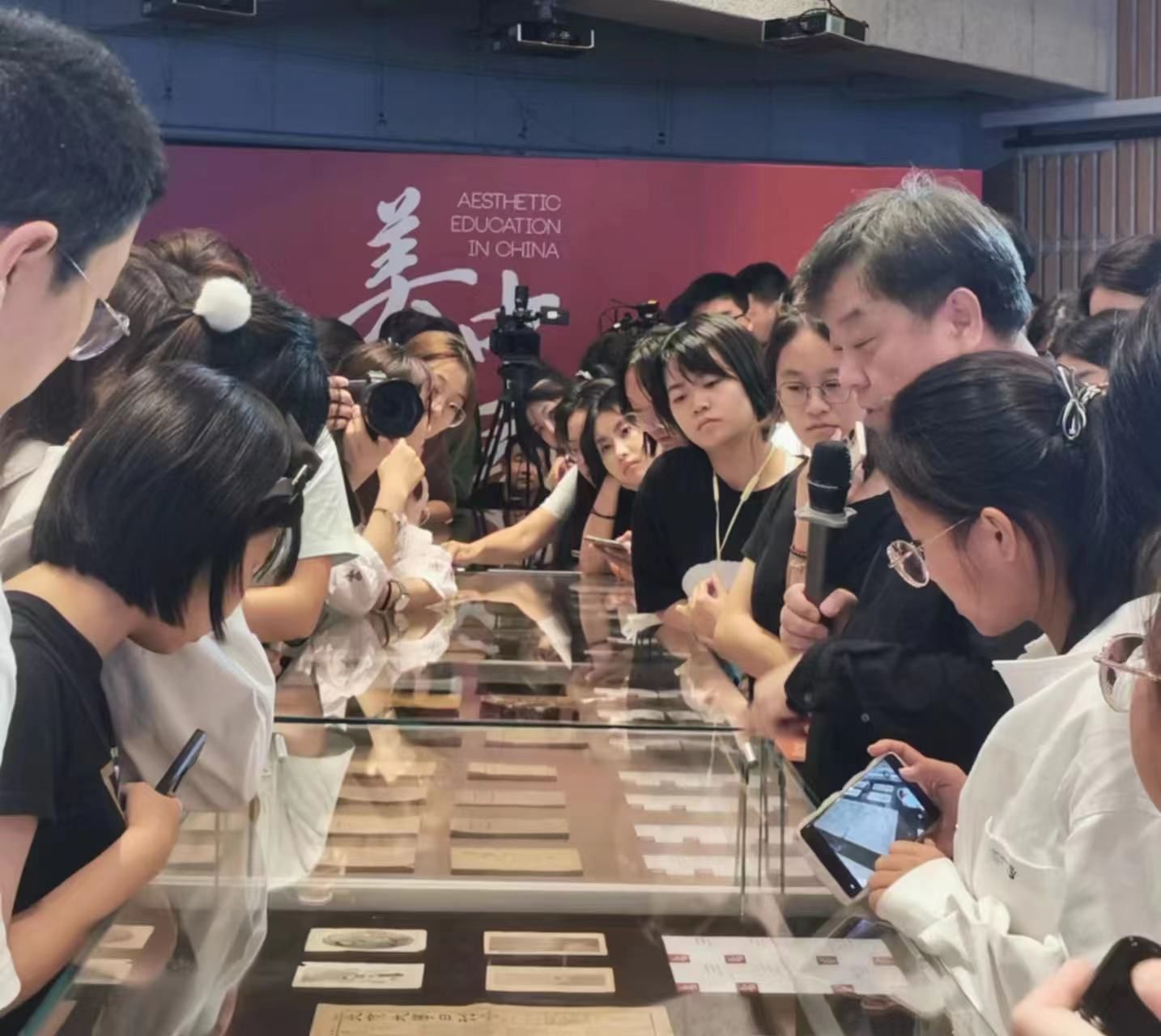“美育中国”系列课程共十讲,面向金沙集团1862cc成色本科学生开设。由李超教授领衔,上海美术学院陈青、蒋铁骊、金江波、程雪松、毛冬华、蒋英、马琳、秦瑞丽、赵蕾、李根、陆丹丹、史晨曦等教师骨干组成授课团队。该课程有国家重大、重点课题成果转化与支持,“美育中国”文献数据库的建设专项成果支持,以珍贵的历史文献原件作为课堂学习交流的生动教材等,形成了本课程值得关注的学术创新格局与特色亮点。在第一节课上,《新青年》杂志、《美学概要》、《谈美》等珍贵文献原件,吸引了不少大一新生隔着玻璃罩细细欣赏,并纷纷举起手机拍照留念。
